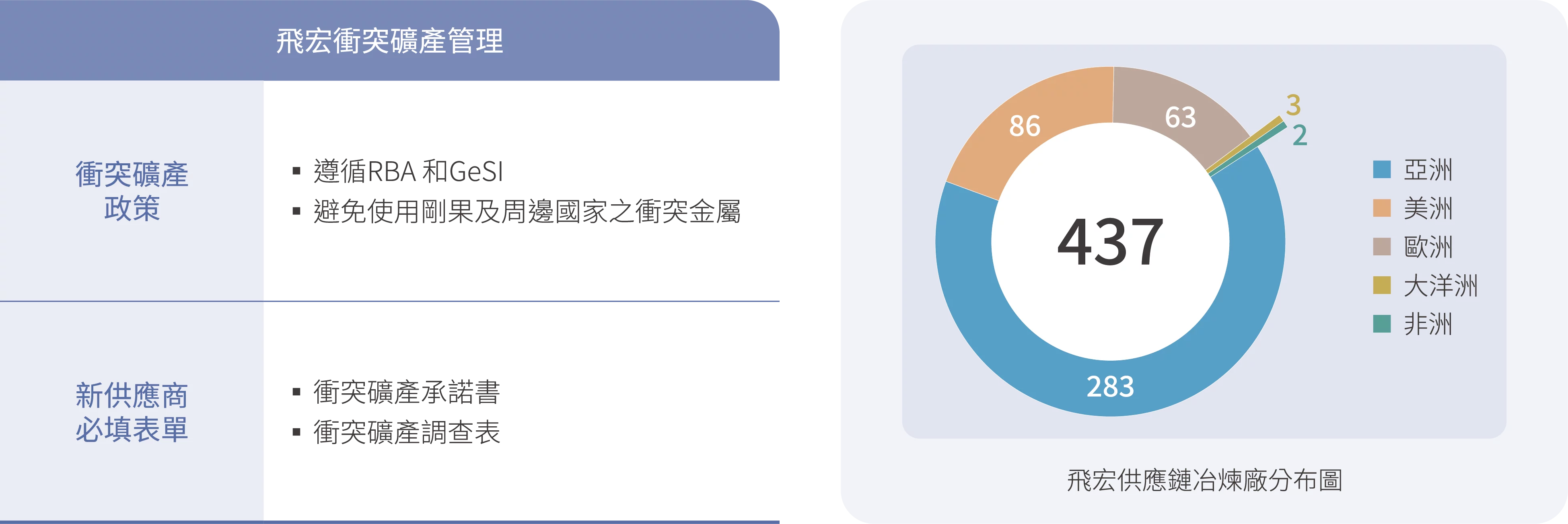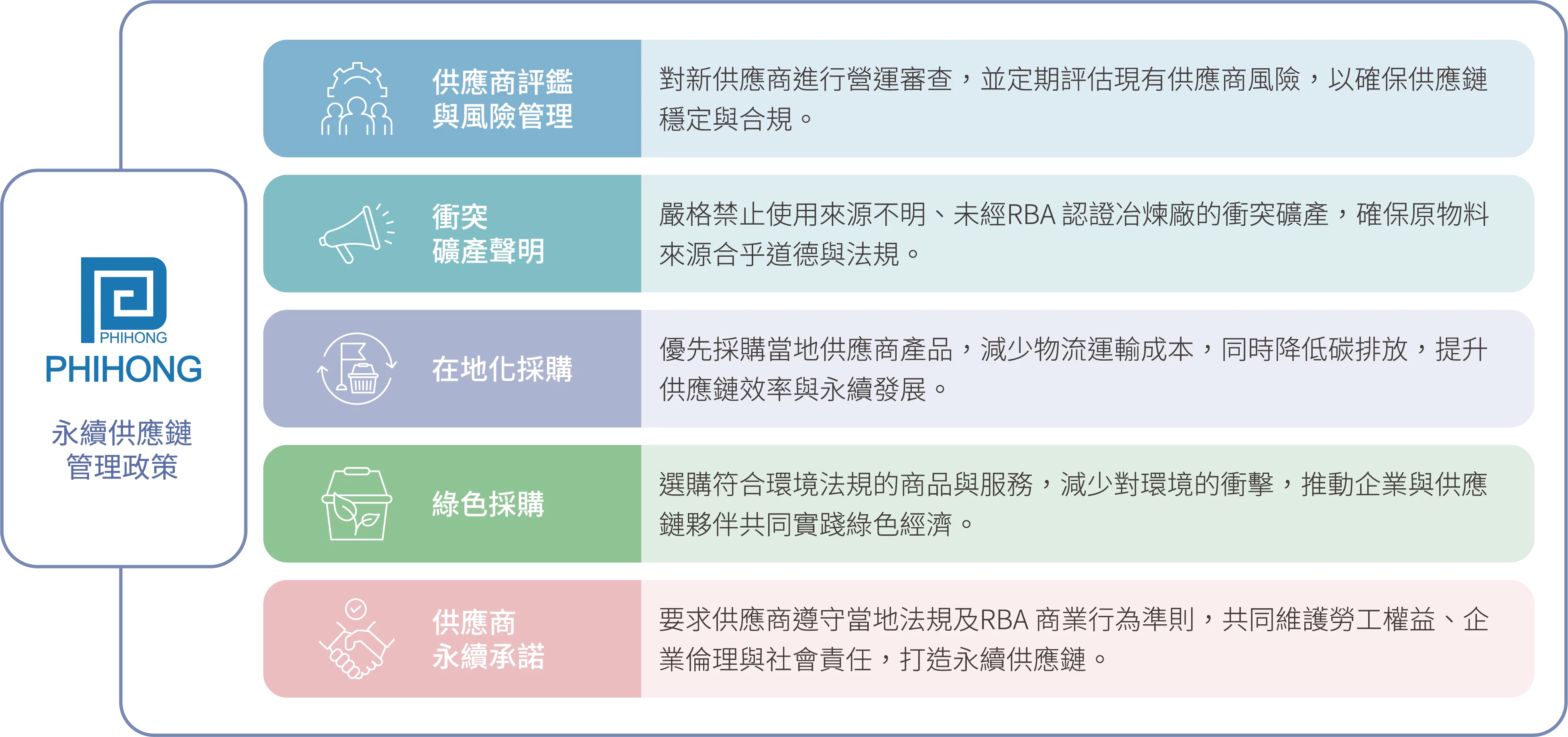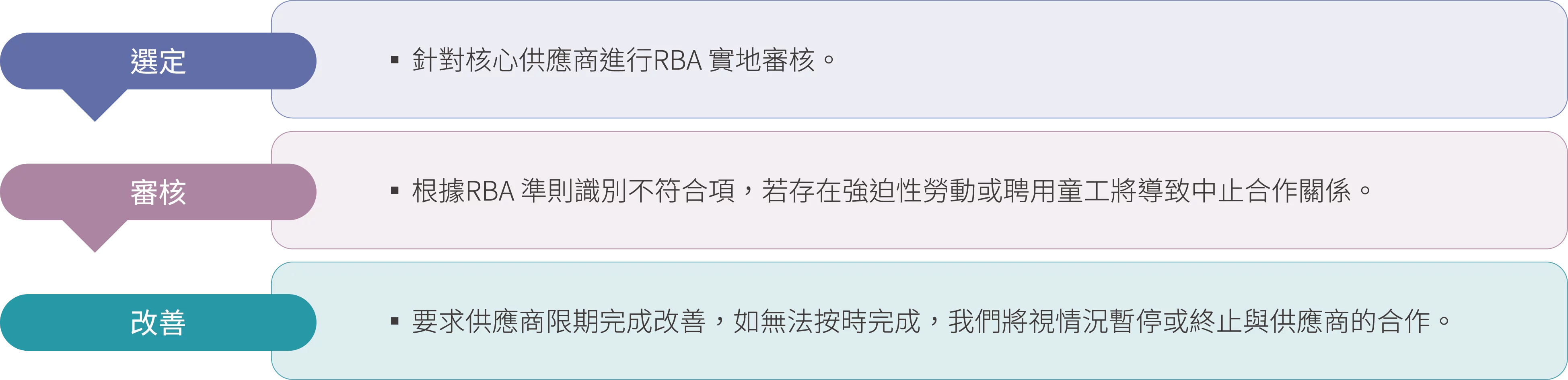 飛宏將ESG( 環境、社會、公司治理) 作為供應商甄選與審核的核心評估標準之一。所有新供應商於合作展開前,需簽署《環保及社會責任承諾書》,內容涵蓋遵守「責任商業聯盟(RBA)」所規範之五大範疇,包括勞工、健康與安全、環境、商業道德及管理系統等準則。我們進一步從以下三大永續指標進行評估: