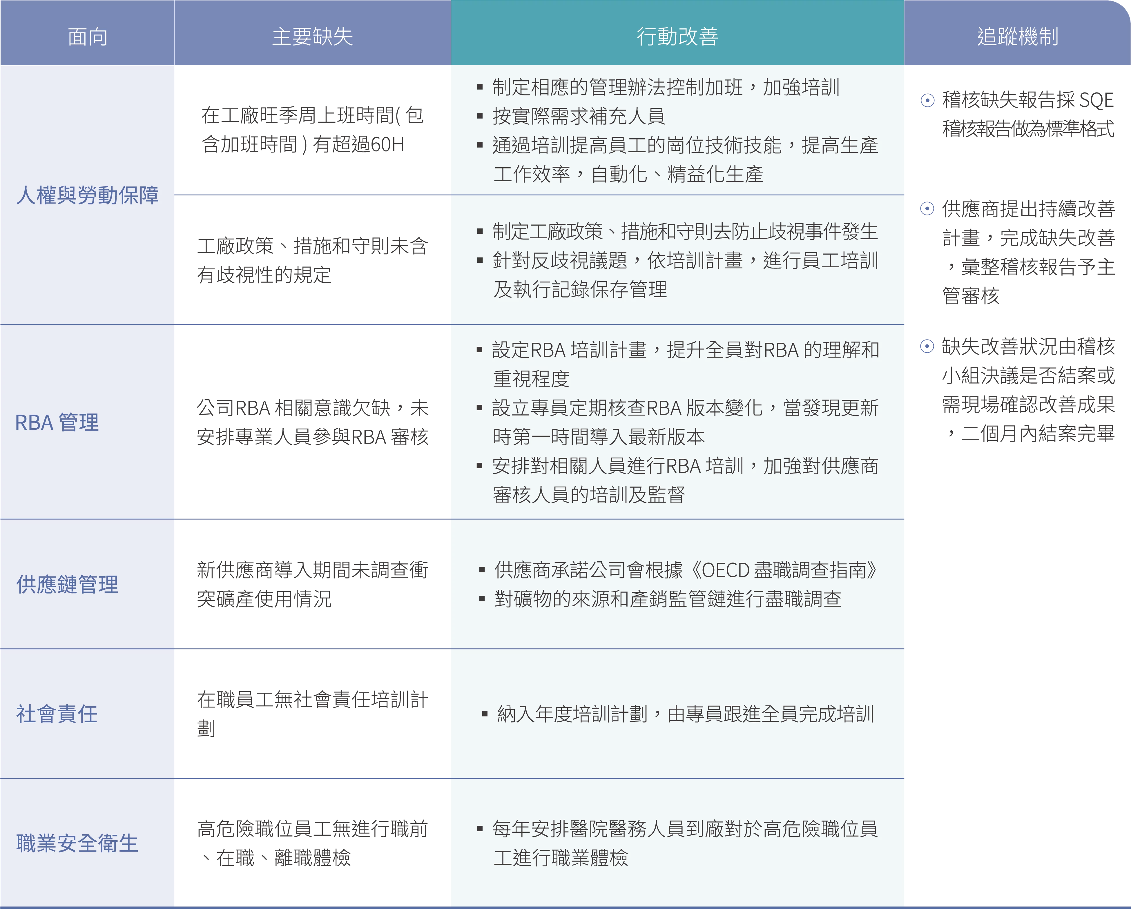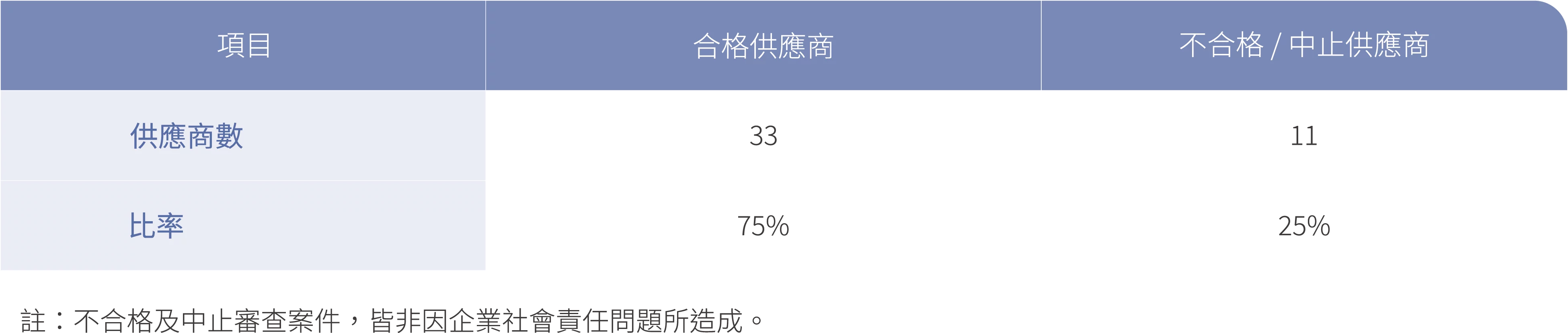 飛宏針對交易金額大於一千萬台幣、合作密切的供應商進行RBA 實地稽核,2024 年RBA 審核14 家供應商,未有供應商因強迫性勞動或聘用童工而導致中止合作關係,整體概況如下表。總體而言,飛宏導入新供應商將100% 審查廠商之環境、社會標準是否合規,若有疑慮則不予導入,並對現行供應商進行相同審查,2024 年度無發現有重大實際或潛在負面衝擊之供應商。