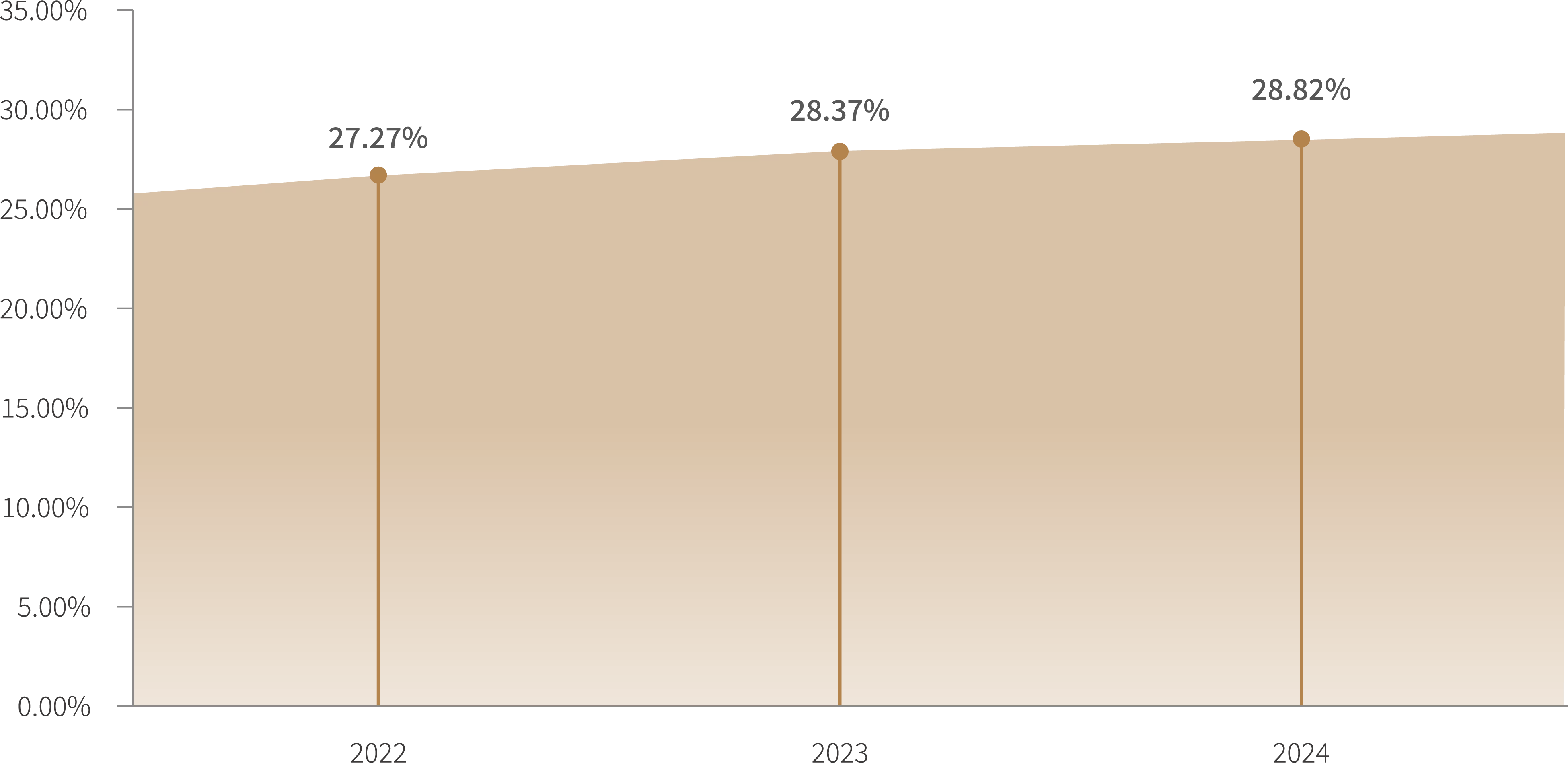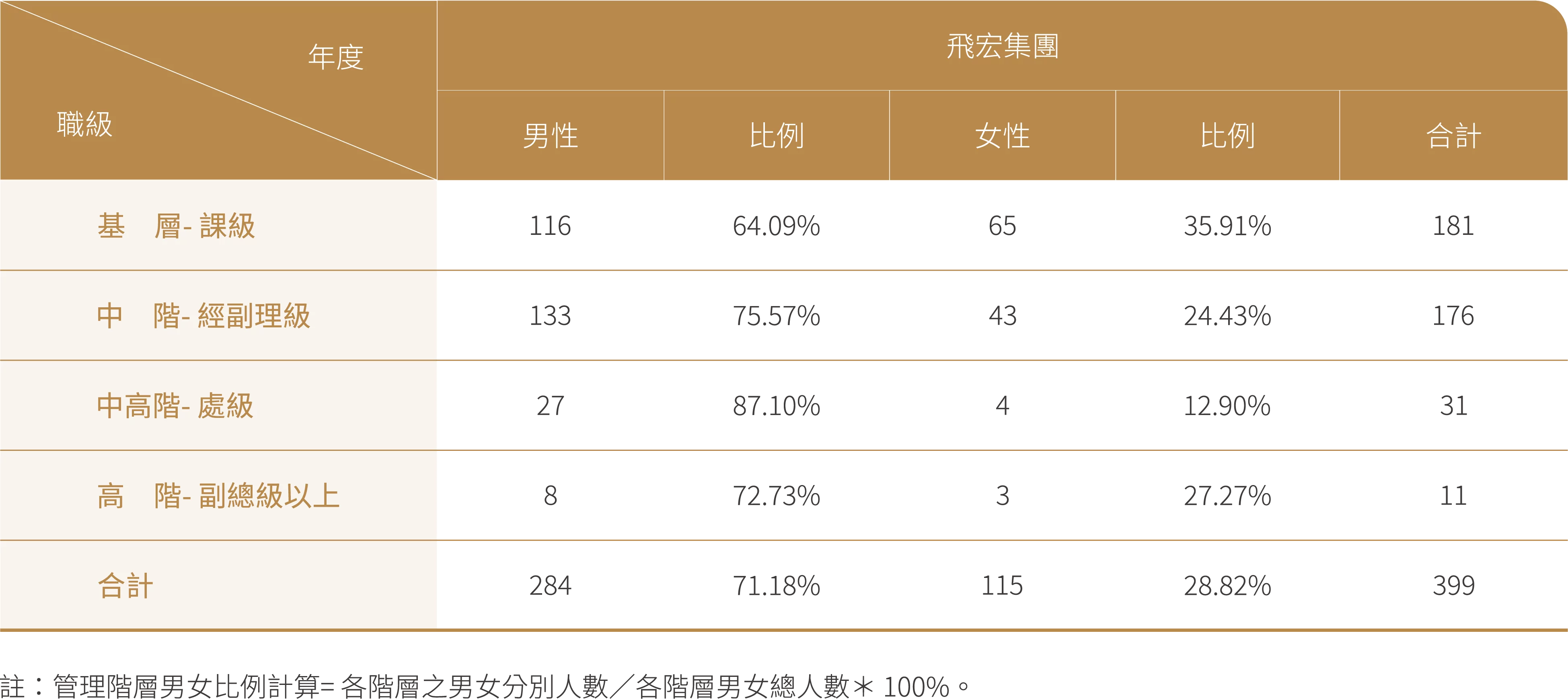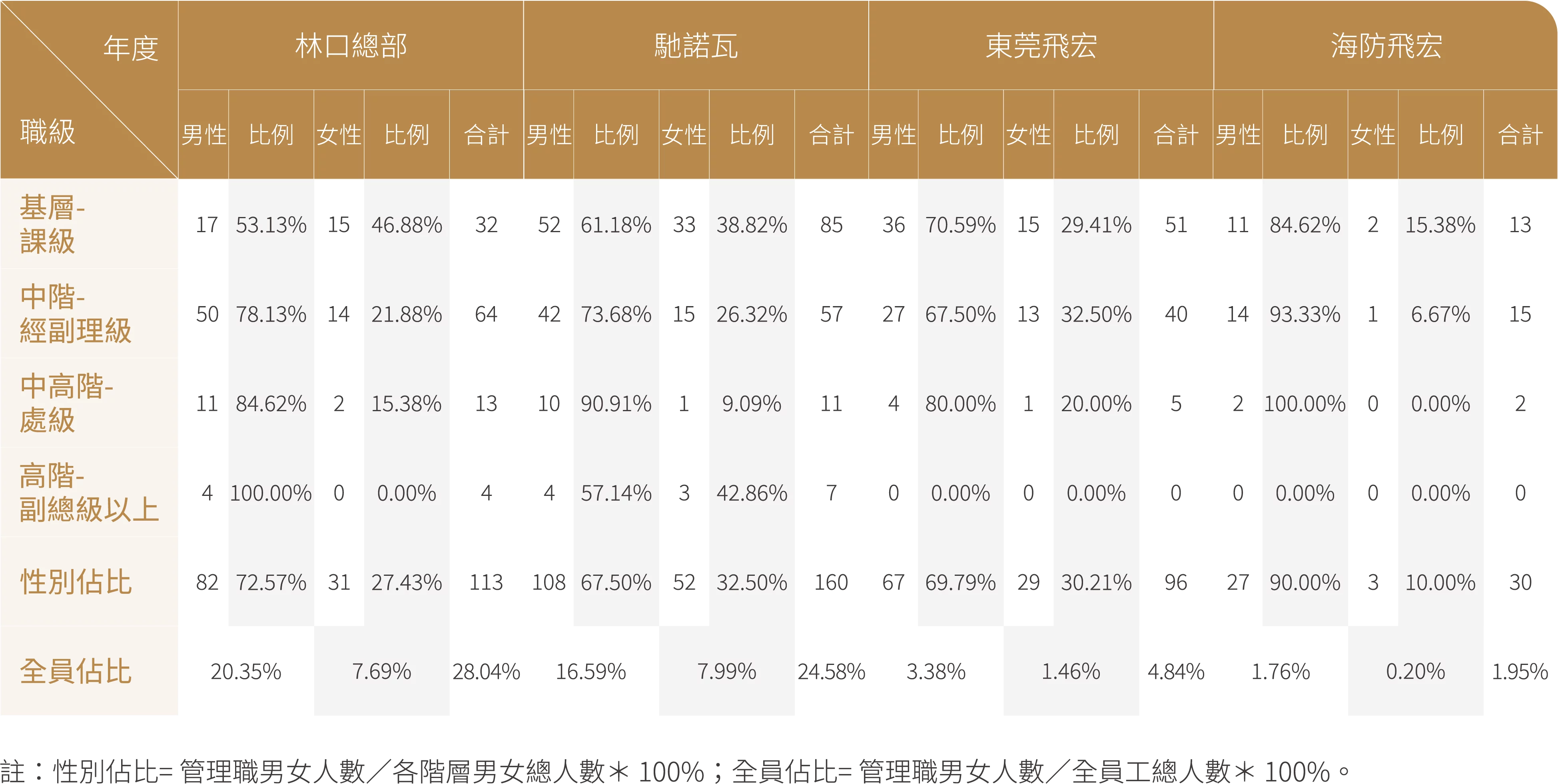 多元、平等、共融的職場環境是我們所追求的,強調性別平等與世代共融,讓每位員工都能在友善的職場中發揮潛能。飛宏所有員工在聘僱、晉升與培育人才,均以職能與潛能為主要考量,無論性別、年齡或其他背景差異,我們積極拔擢表現優異的夥伴,鼓勵支持向上發展。近年我們特別重視中高齡人才的發展與招聘,他們豐富的經驗與專業知識是公司成長強而有力的後盾。2024 年飛宏男性員工比例52.11%、女性員工比例47.89%,男女員工比例趨於平衡。管理職人員女性課級以上主管較去年增加了約15 位,占管理職比例28.82%,女性主管佔比屢創新高。
