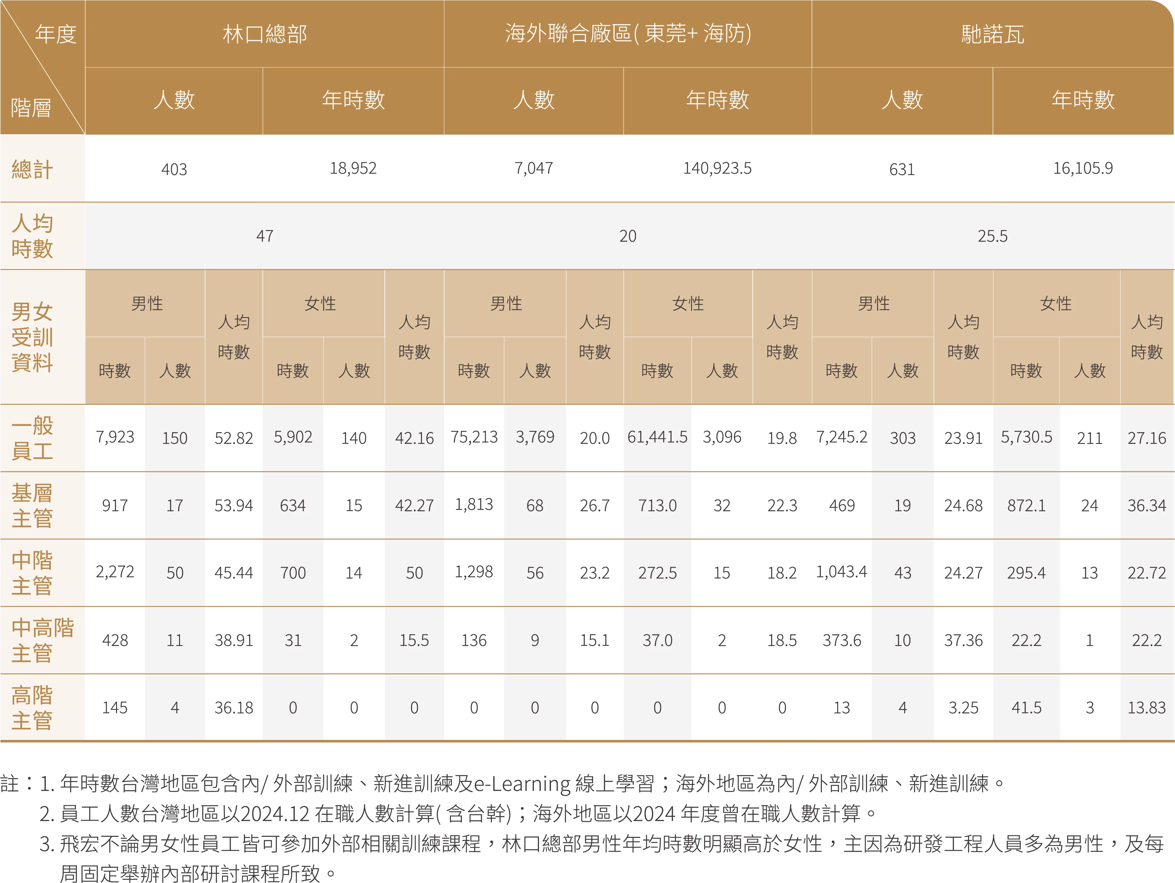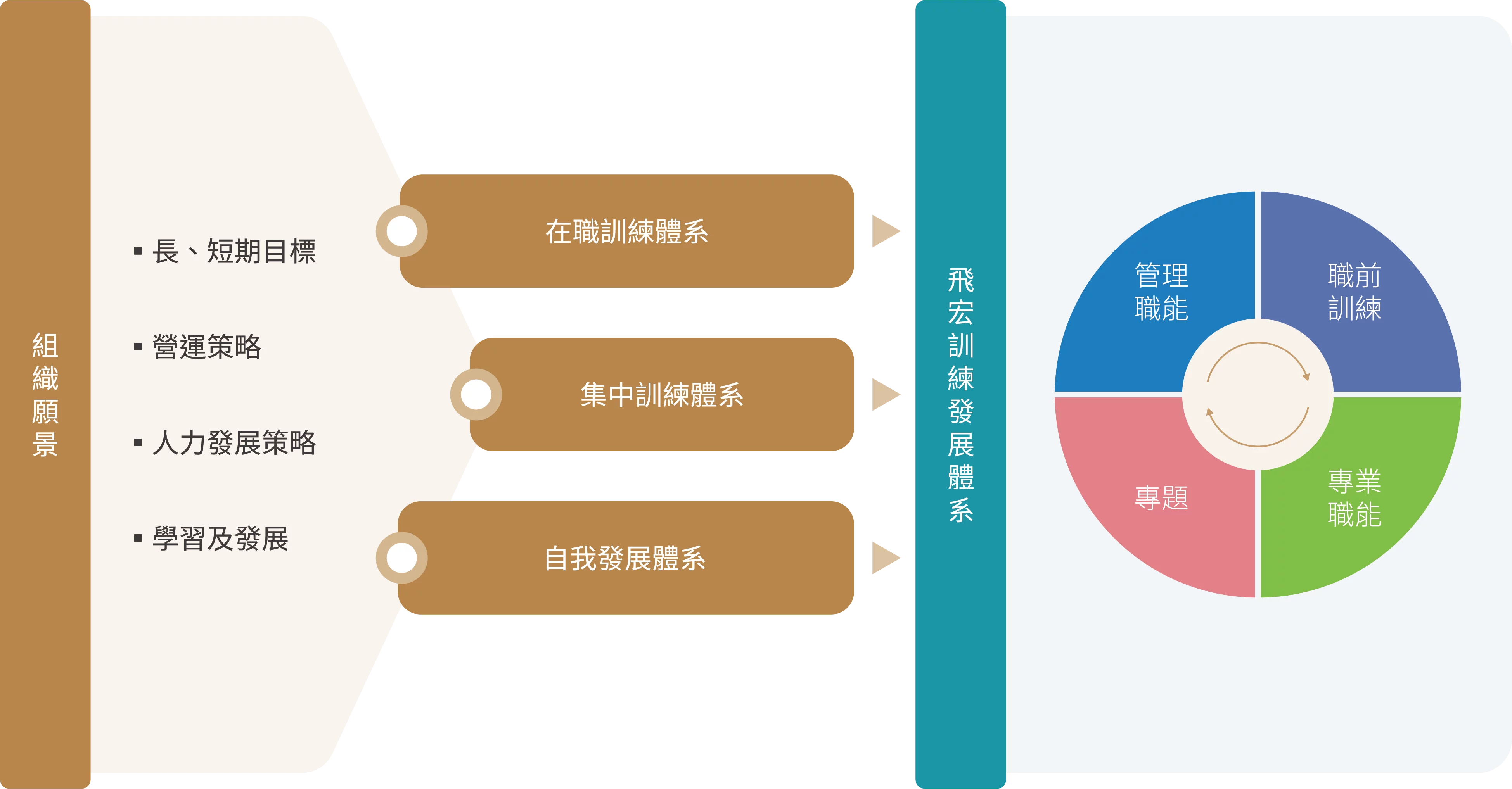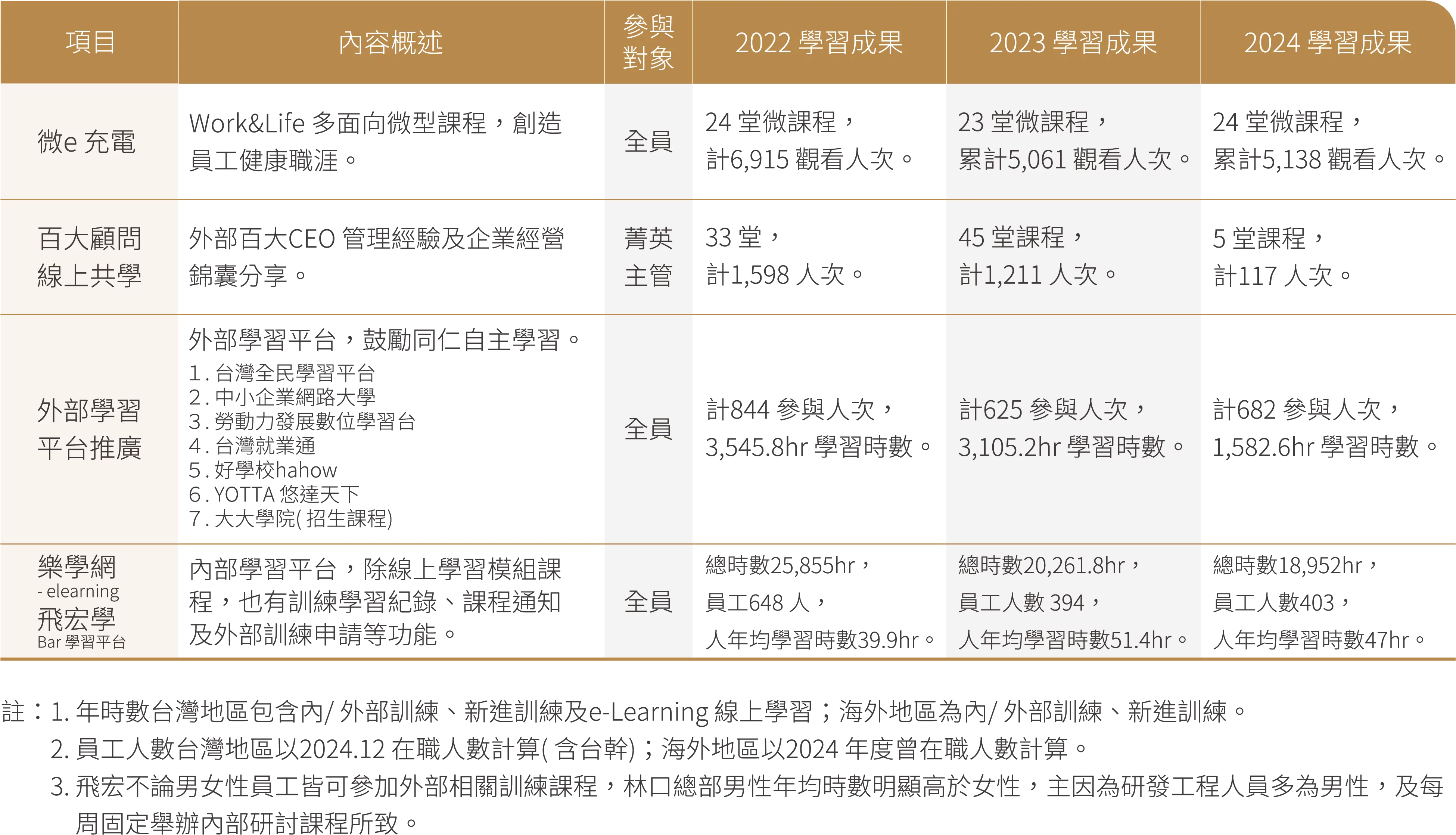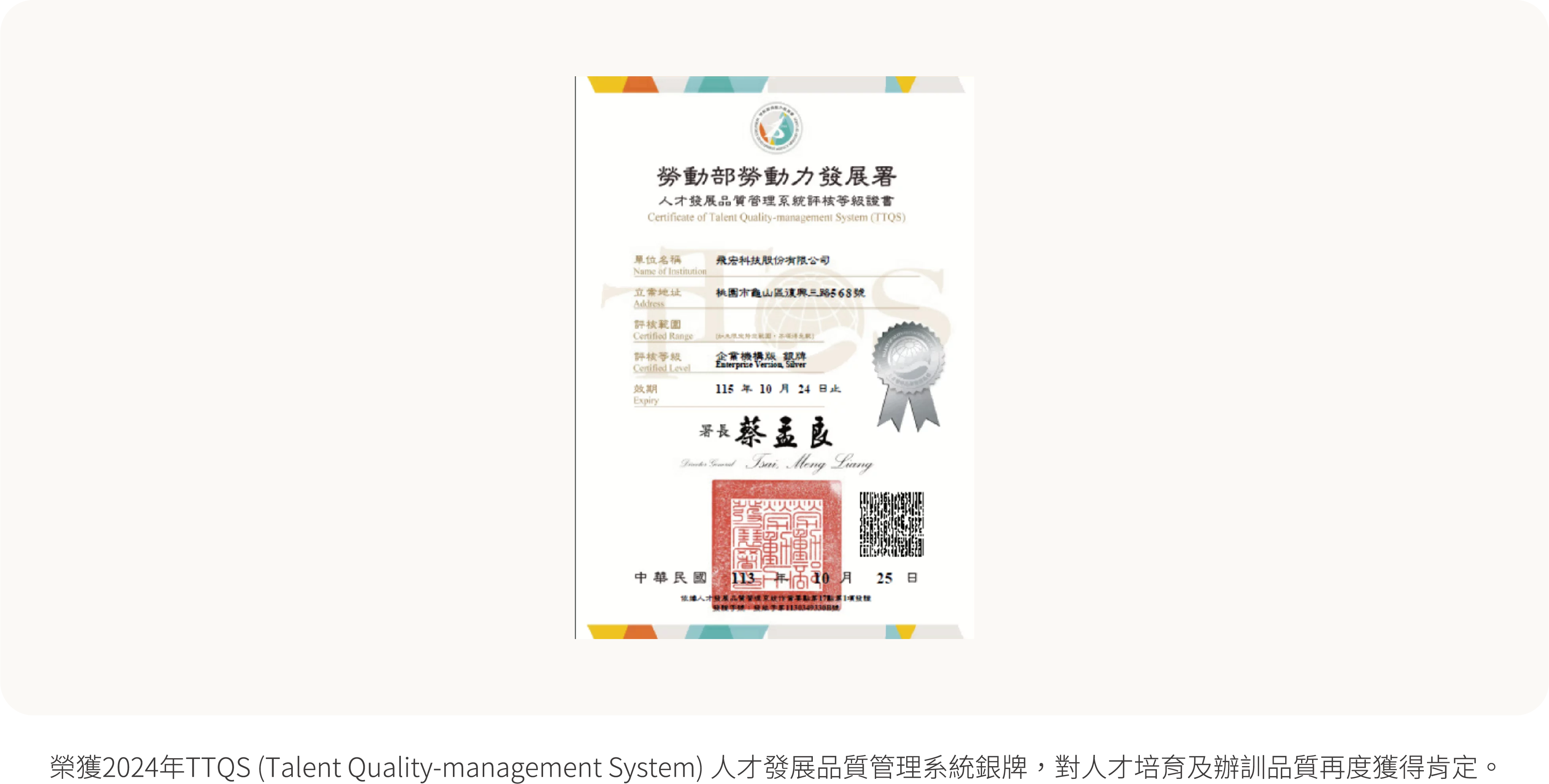 飛宏將人才發展視為企業永續經營的核心,致力提升員工的專業能力和職涯發展。透過「教育訓練與晉升體系架構」,我們將學習時數納入晉升條件,鼓勵員工自主學習,營造積極的學習環境。我們致力於打造學習型組織,提供多元學習機會,強化員工競爭力,推動企業與個人共同成長。同時,飛宏遵循行政院勞動部的TTQS 人才發展品質管理系統,並於2024 年再次榮獲銀牌認證,展現對人才培育的承諾。