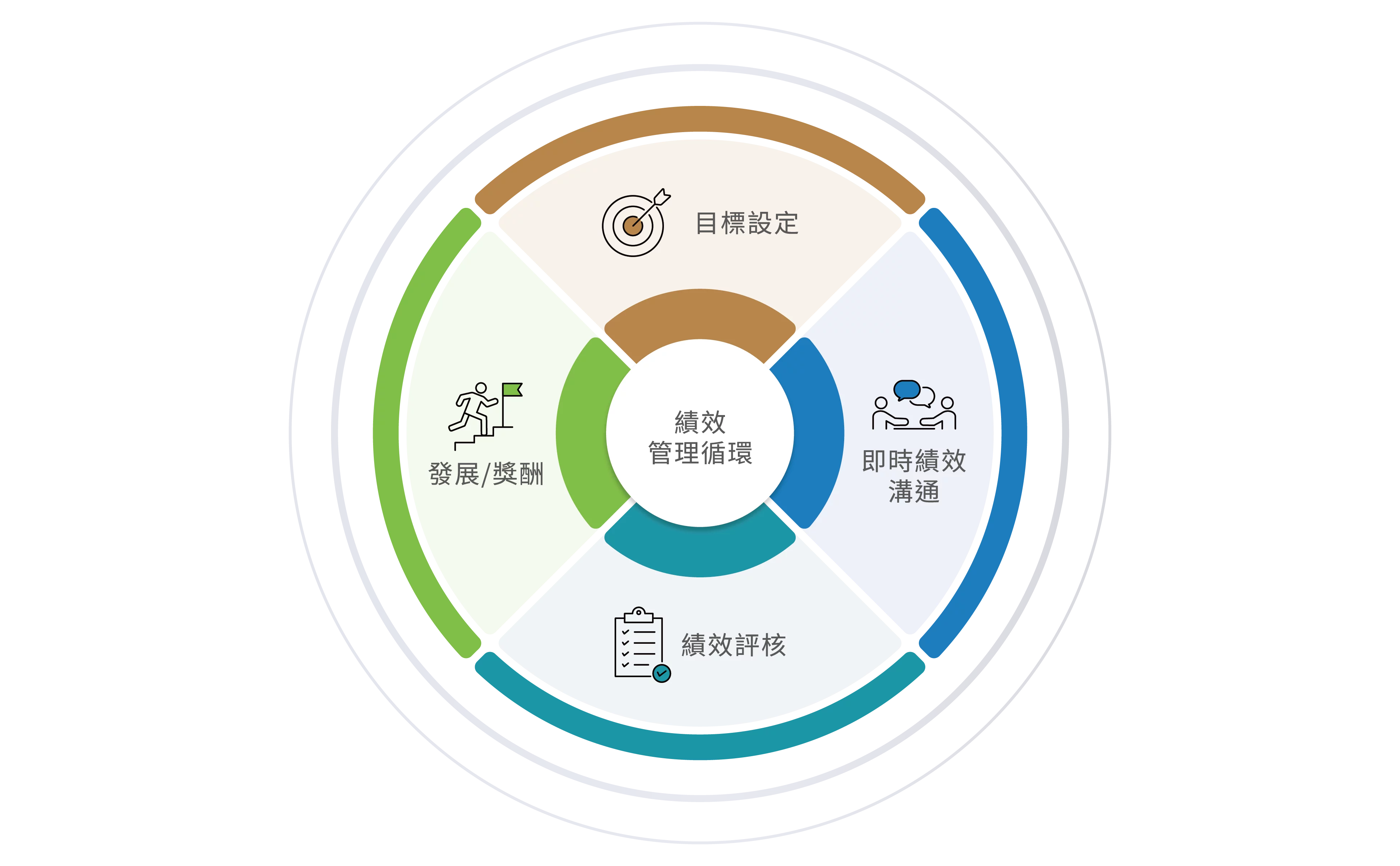 飛宏依據整體年度營運策略與個人目標,運作績效管理系統,並定期追蹤和檢視進度,確保公司目標與主管及基層員工的績效目標一致,並及時調整策略。利用e化管理系統,根據設定的目標與員工持續進行績效溝通與討論,了解目標達成狀況,協助員工提升工作表現及發展能力。實現與直屬員工的雙向溝通與即時反饋,進而提高公司競爭力及團隊整體績效。透過績效目標管理,有效掌控工作成果,提升效率,激勵員工士氣,並促進員工持續成長。