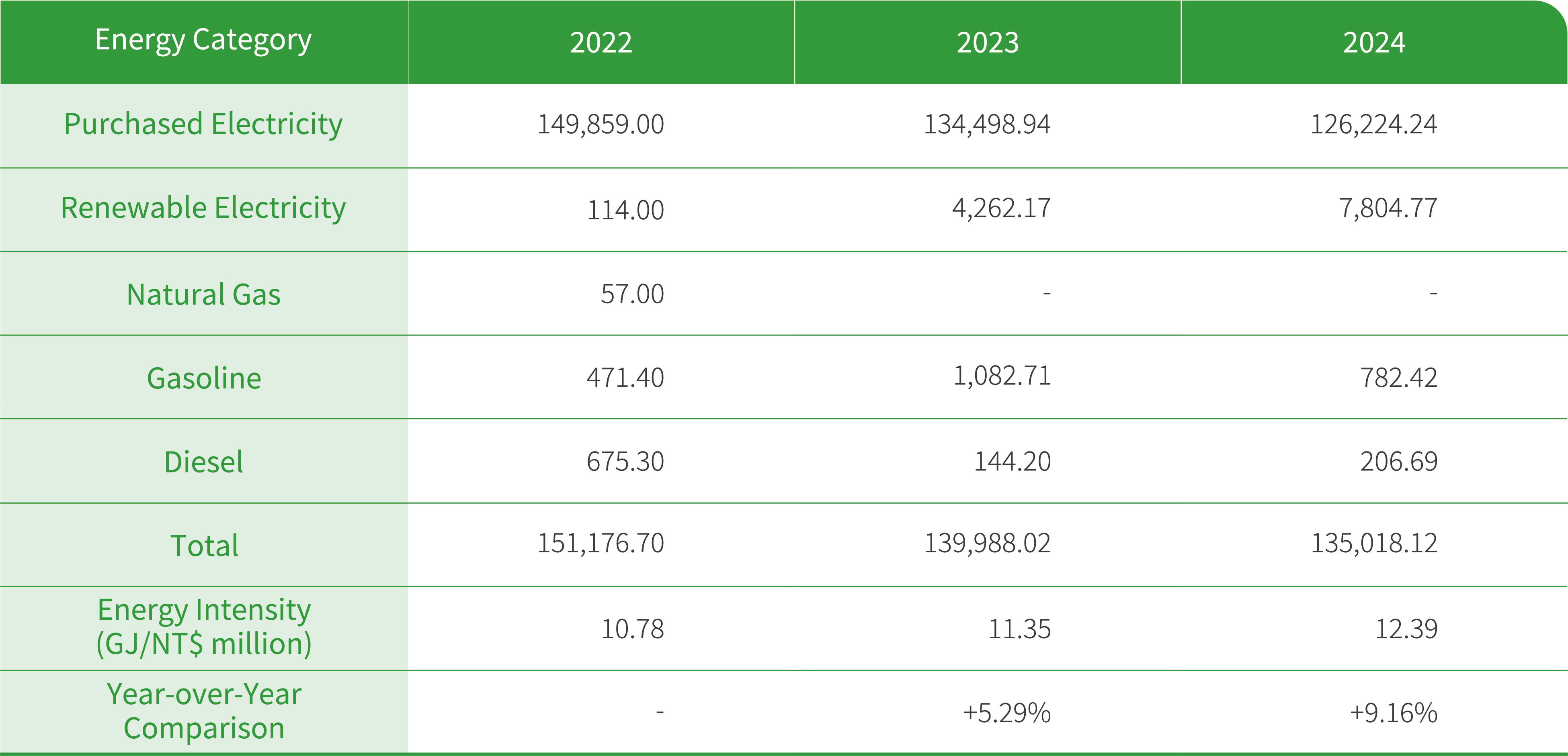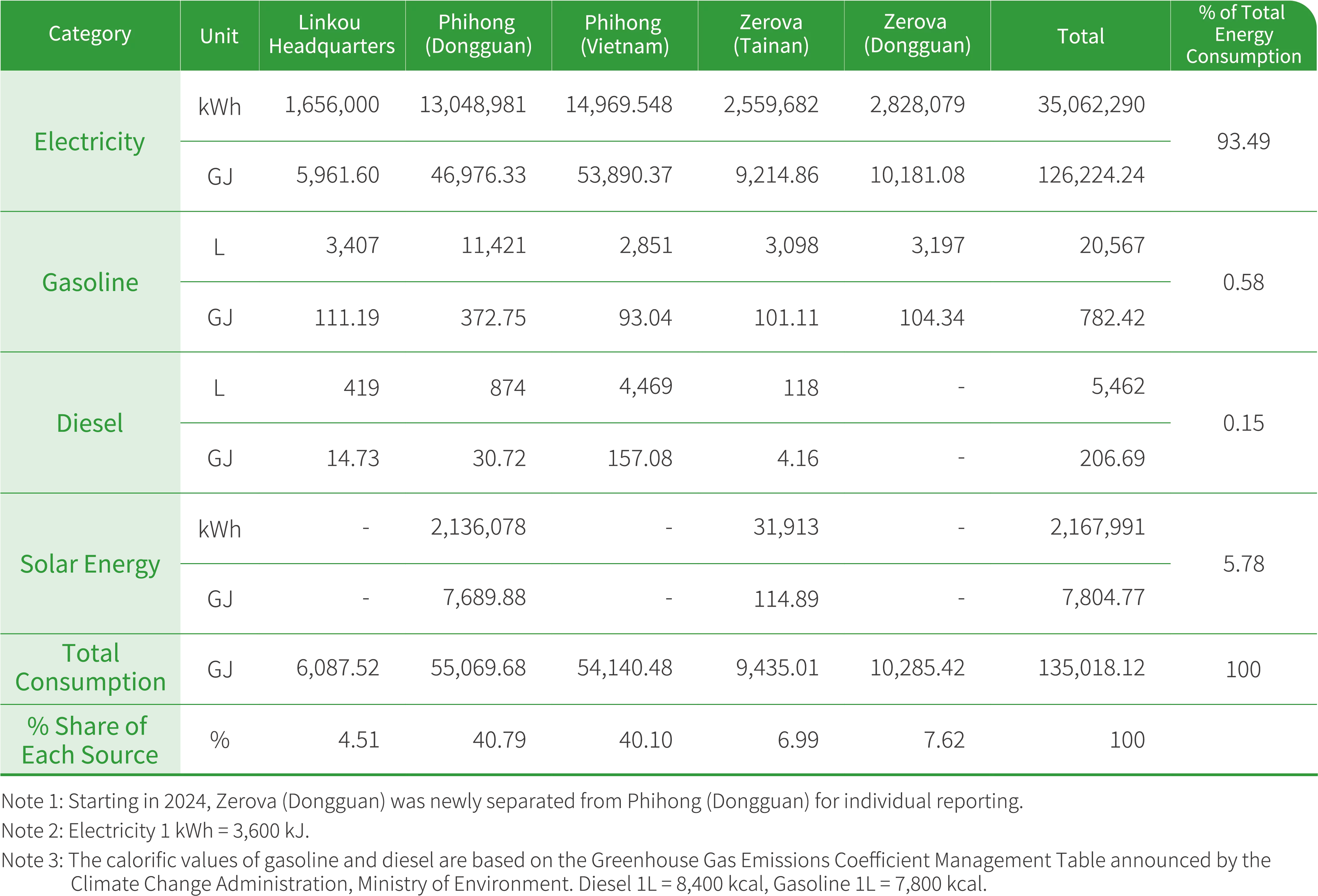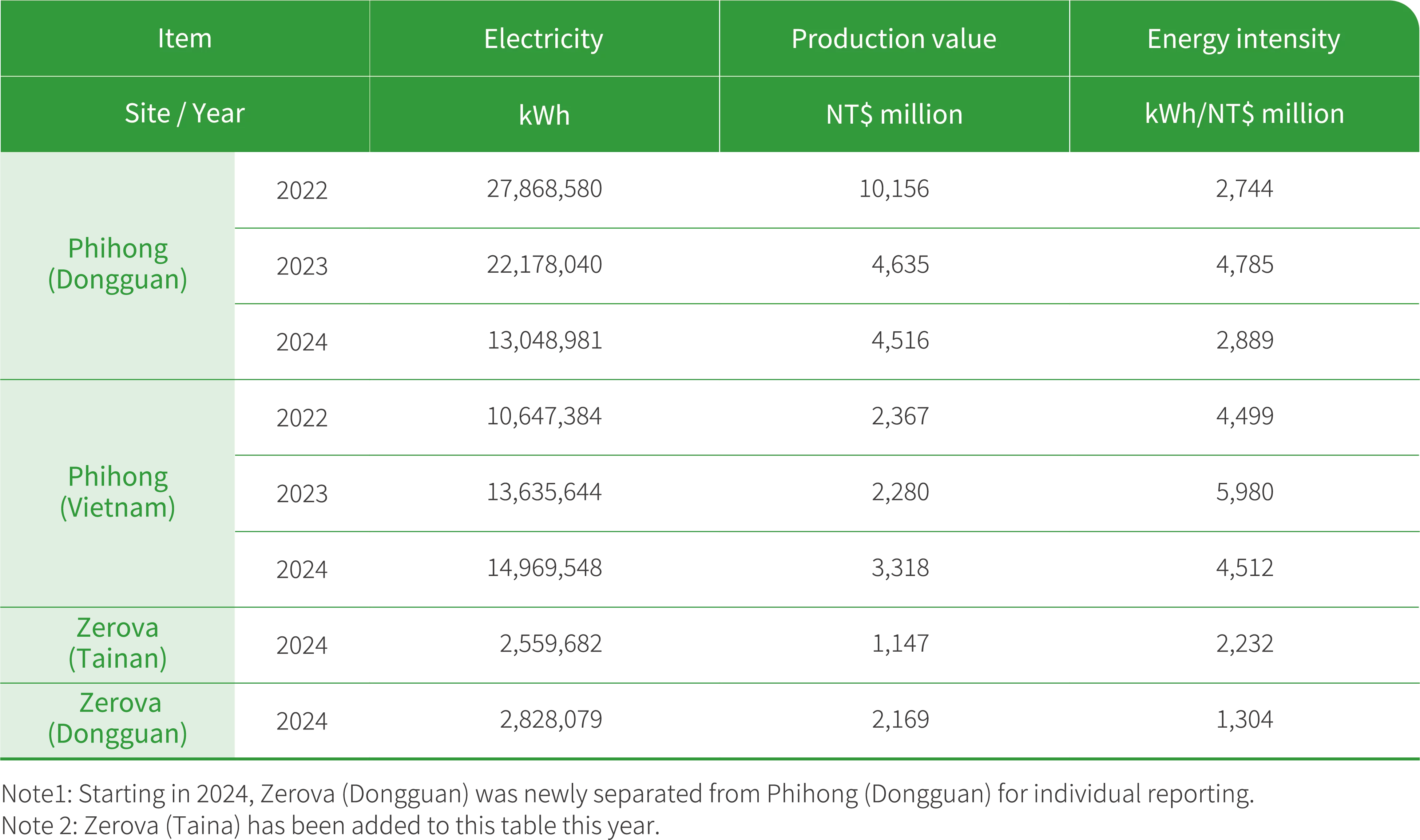 Starting from 2023, Phihong (Dongguan) responded to the clean energy transition trend by fully phasing out the use of natural gas, achieving 100% electricity-based energy supply, and further optimizing the energy structure. At the same time, the usage of gasoline and diesel also significantly decreased compared to the 2021 base year. In 2024, the Phihong (Dongguan) continued to promote energy-saving technological upgrades, expand solar power generation, and implement refined energy management practices. These efforts delivered significant results. In 2024, the electricity supply at the Phihong (Vietnam) remained stable, with no power outages reported. The plant’s remained focused on purchased electricity, and diesel was used only for generator testing purposes. Recognizing the positive correlation between energy usage, production scale, and revenue, Phihong acknowledges that a comparison of absolute energy usage alone cannot fully reflect energy efficiency improvements. Therefore, the Company uses “Energy Intensity” as the basis for annual target setting to more accurately measure the actual effectiveness of energy-saving measures.