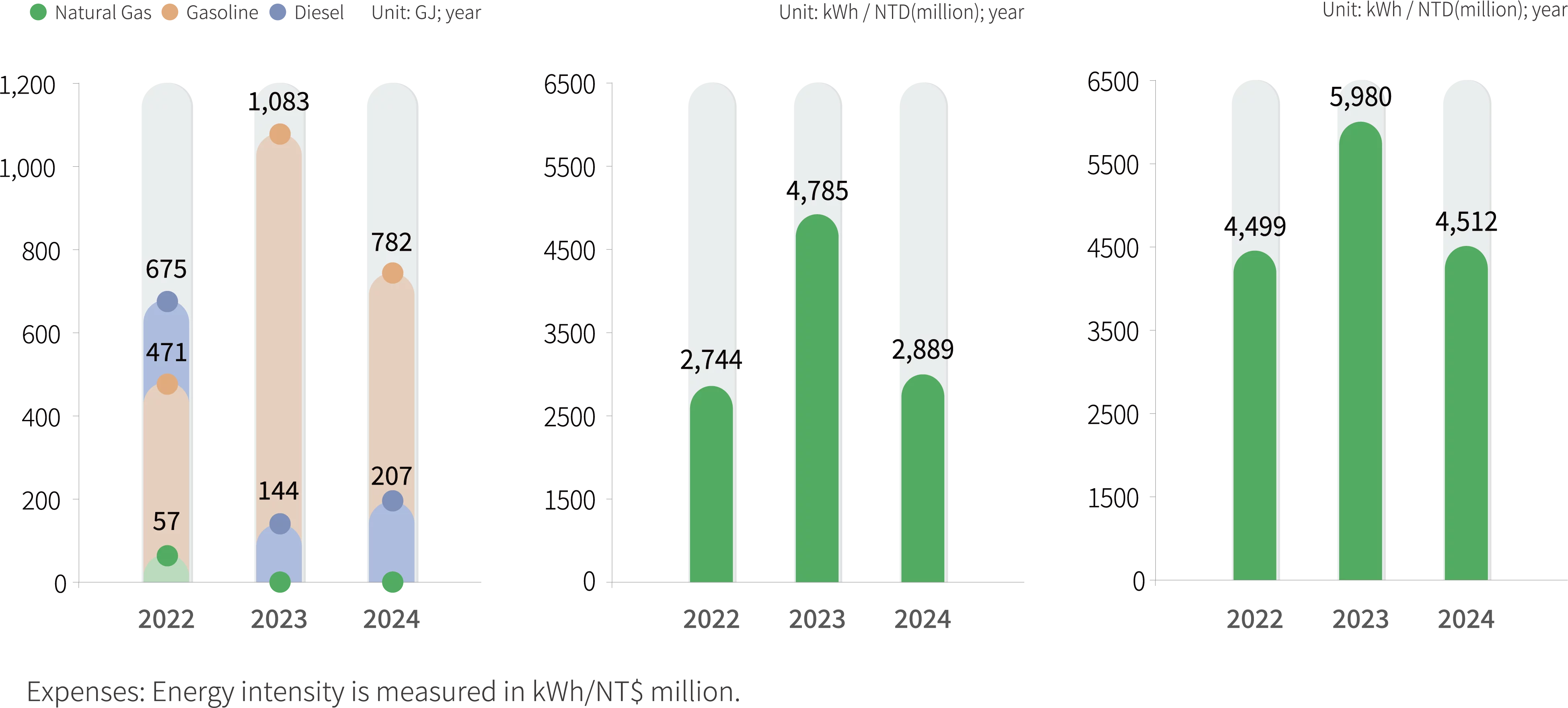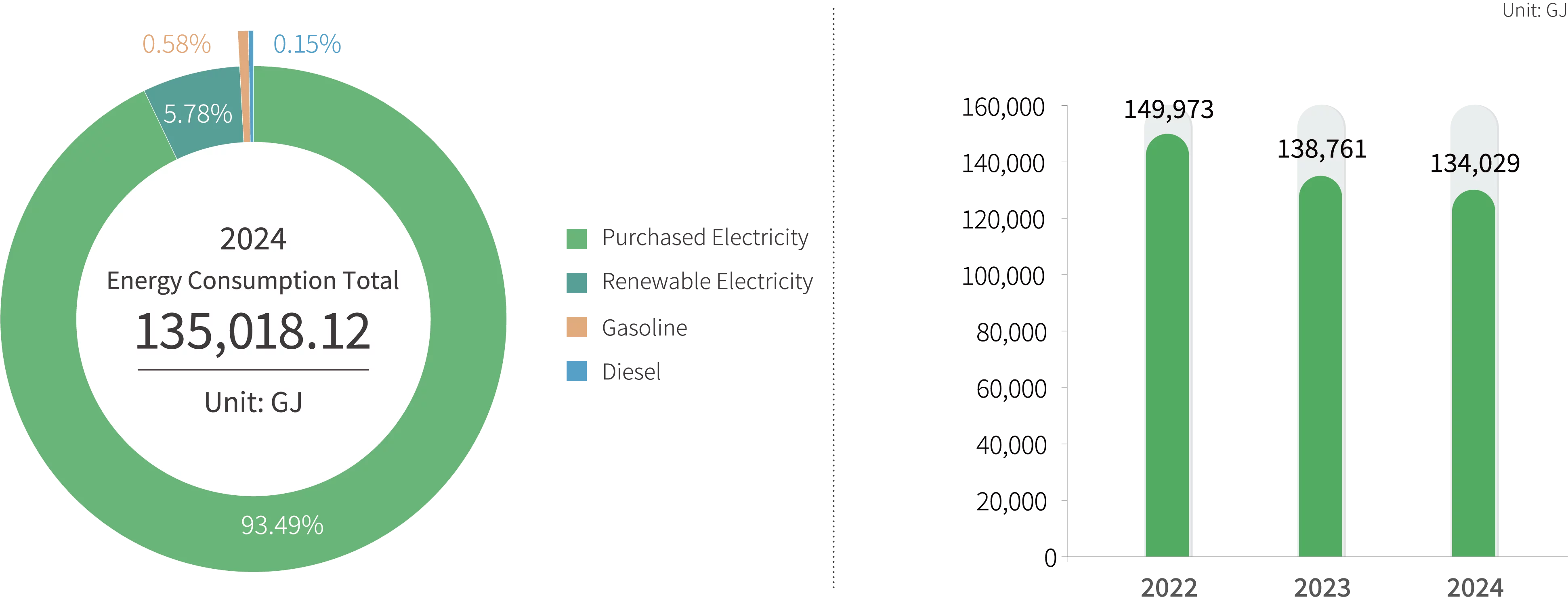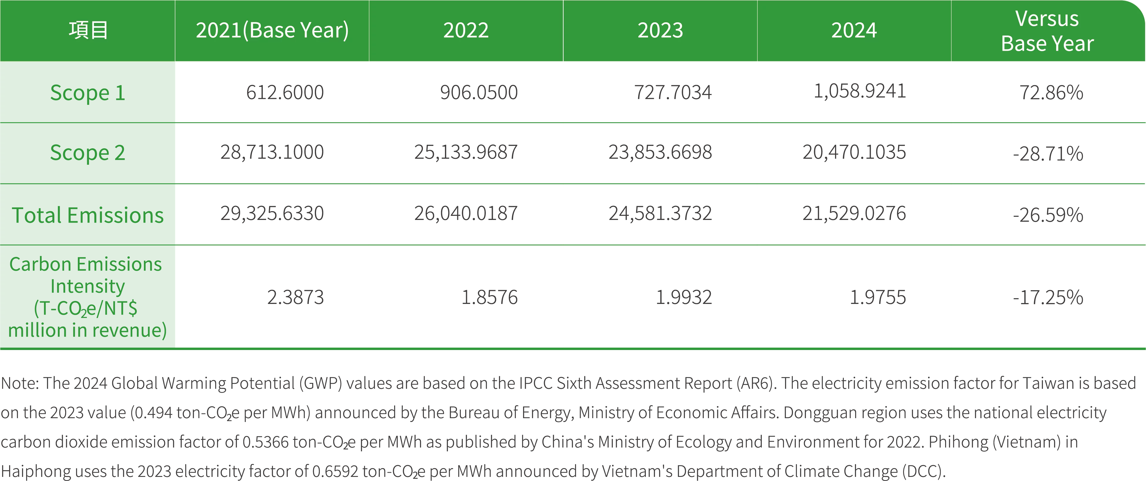 Starting from 2023, Phihong (Dongguan) responded to the clean energy transition trend by fully phasing out the use of natural gas, achieving 100% electricity-based energy supply, and further optimizing the energy structure. At the same time, the usage of gasoline and diesel also significantly decreased compared to the 2021 base year. In 2024, the Phihong (Dongguan) continued to promote energy-saving technological upgrades, expand solar power generation, and implement refined energy management practices. These efforts delivered significant results. In 2024, the electricity supply at the Phihong (Vietnam) remained stable, with no power outages reported. The plant’s remained focused on purchased electricity, and diesel was used only for generator testing purposes. Recognizing the positive correlation between energy usage, production scale, and revenue, Phihong acknowledges that a comparison of absolute energy usage alone cannot fully reflect energy efficiency improvements. Therefore, the Company uses “Energy Intensity” as the basis for annual target setting to more accurately measure the actual effectiveness of energy-saving measures.
