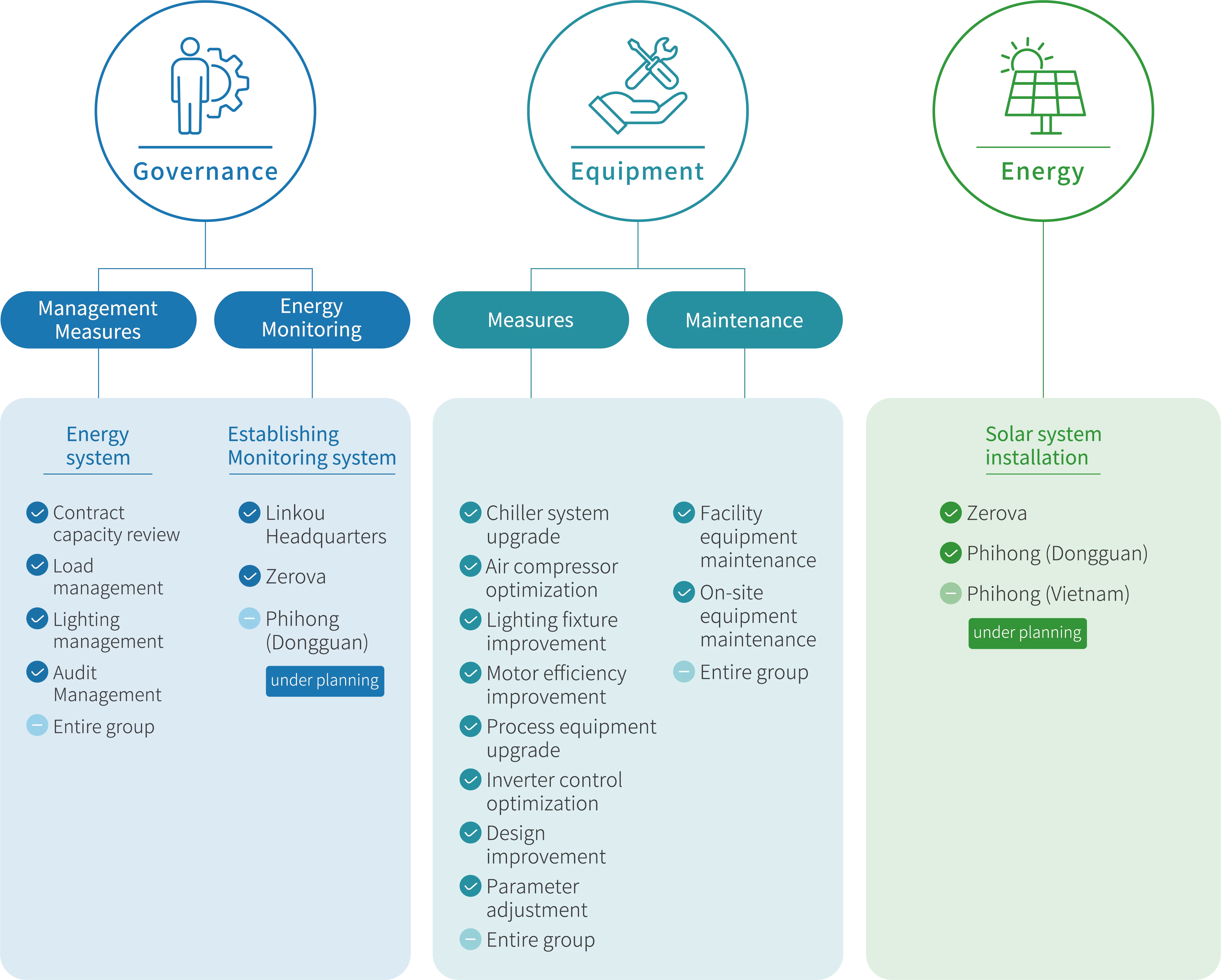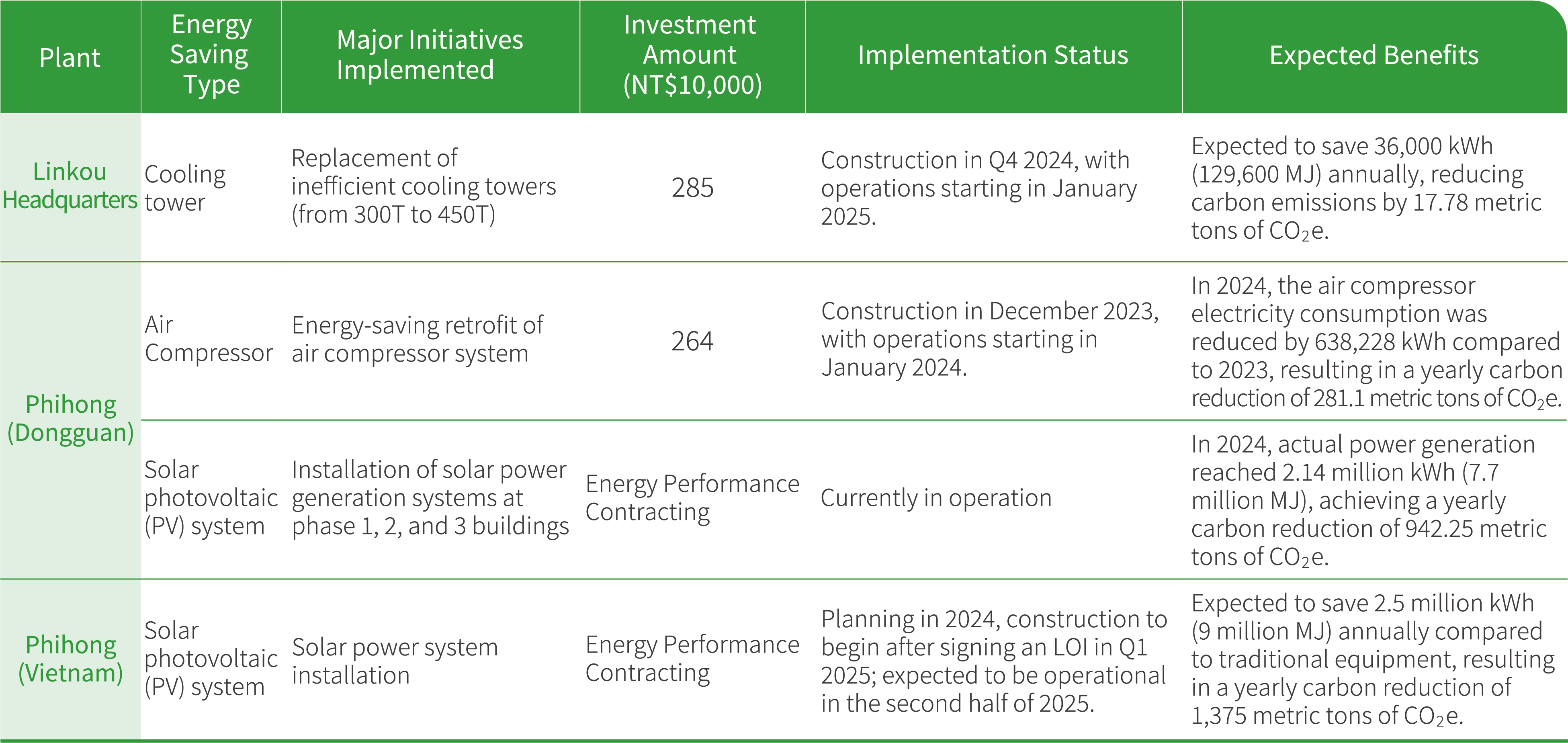 In 2024, Phihong actively advanced its energy management practices by establishing an Energy Management Team and implementing an Energy Management System. Through continuous energy monitoring and audits, the Company identified opportunities for efficiency improvement, set measurable energy-saving targets, and regularly tracked and reported performance to ensure effective implementation and continuous enhancement. In terms of equipment upgrades, the Linkou Headquarters redesigned and replaced the cooling towers with high-efficiency energy-saving models in 2024 to improve the operational efficiency of the chiller systems. Meanwhile, Phihong (Dongguan) successfully operated solar power generation systems across phase 1, 2, and 3 of the plant, generating 2.14 million kWh (7.7 million MJ) of electricity over the year and reducing carbon emissions by 942.25 metric tons of CO2e. In addition, the Haiphong plant in Vietnam is actively planning the installation of a solar energy system, scheduled to begin operations in the second half of 2025. The project is expected to save 2.5 million kWh (9 million MJ) annually compared to the old equipment, reducing carbon emissions by 1,375 metric tons of CO2e. These initiatives further demonstrate Phihong’s commitment to renewable energy adoption and its broader sustainability goals.