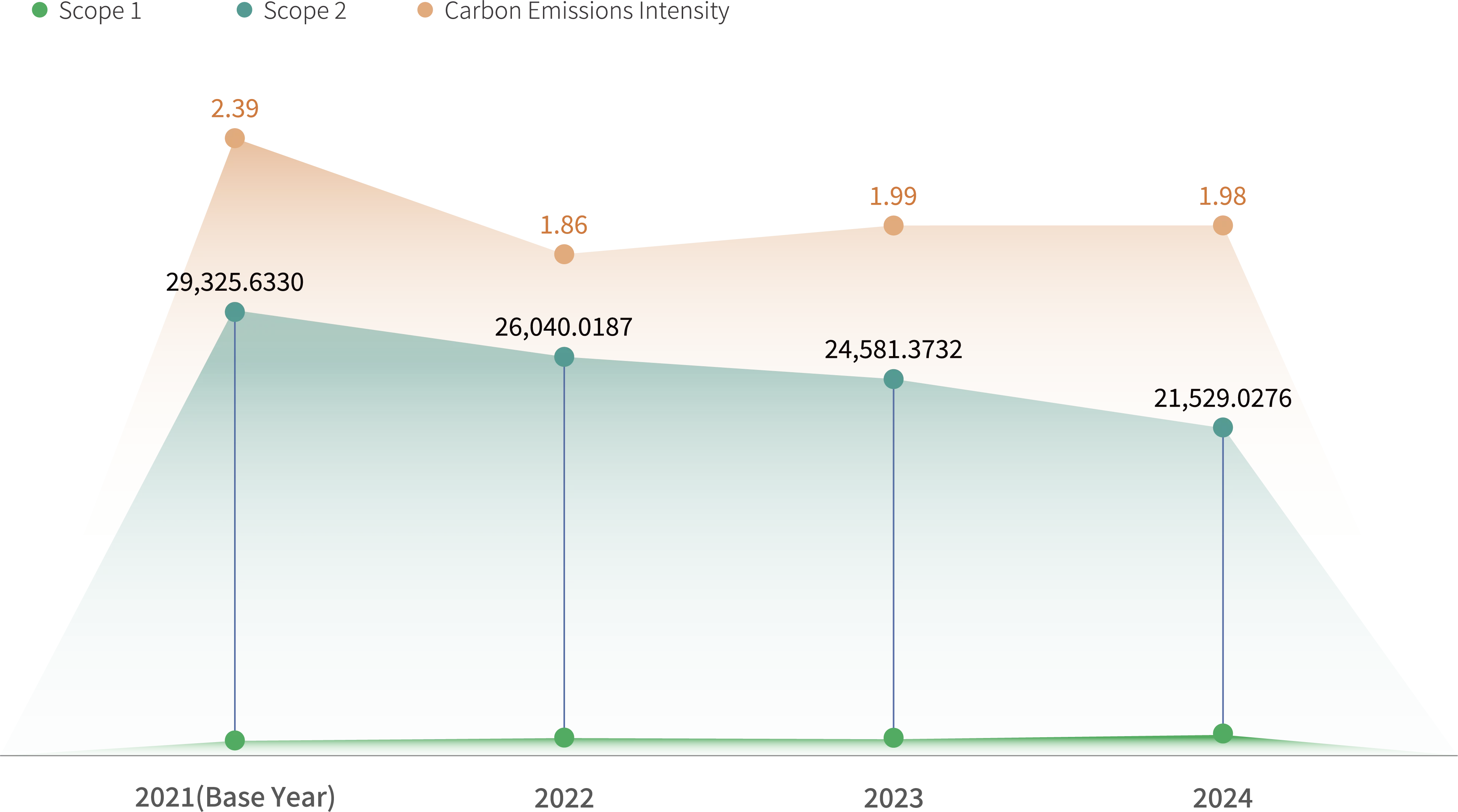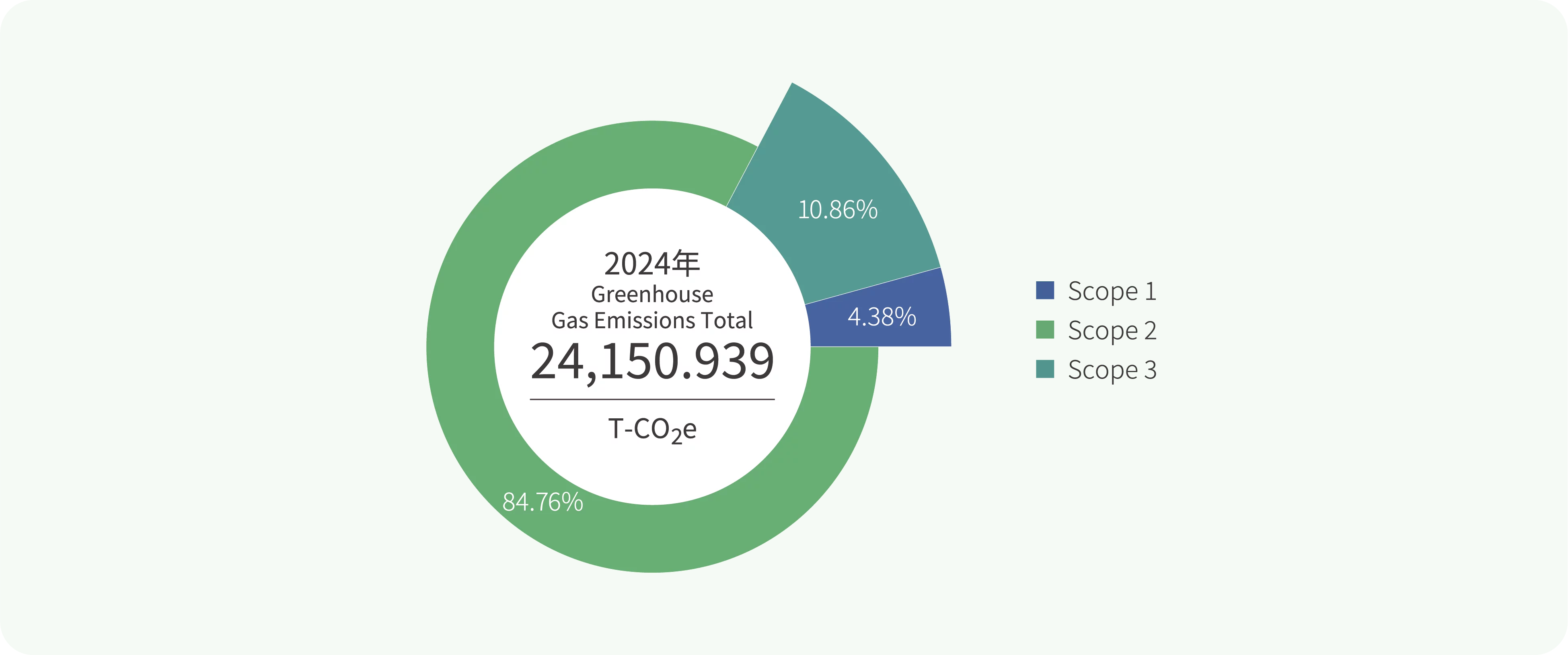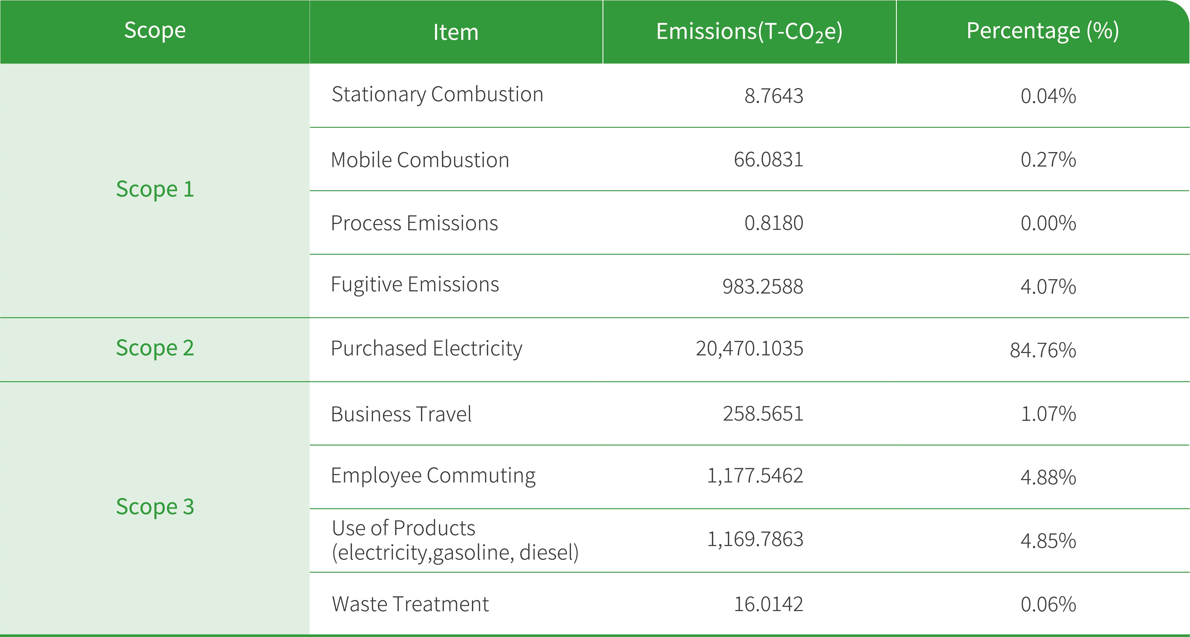 In 2024, Phihong continued to conduct GHG inventories in accordance with the ISO 14064-1:2018 standard. The results show that the primary source of emissions was Scope 2 purchased electricity, which accounted for 84.76% of total GHG emissions. To reduce Scope 2 emissions, Phihong introduced the ISO 50001:2018 in 2024 to establish electricity-saving targets and enhance equipment energy efficiency. In addition, we continuously focus on green energy development and have actively promoted the planning and implementation of solar energy generation projects, striving to further reduce GHG emissions. Compared to the base year (2021), the Group achieved a 26.59% reduction in combined Scope 1 and Scope 2 emissions in 2024. This represents 63.31% progress toward the Group’s SBTi target of a 42% reduction by 2030.