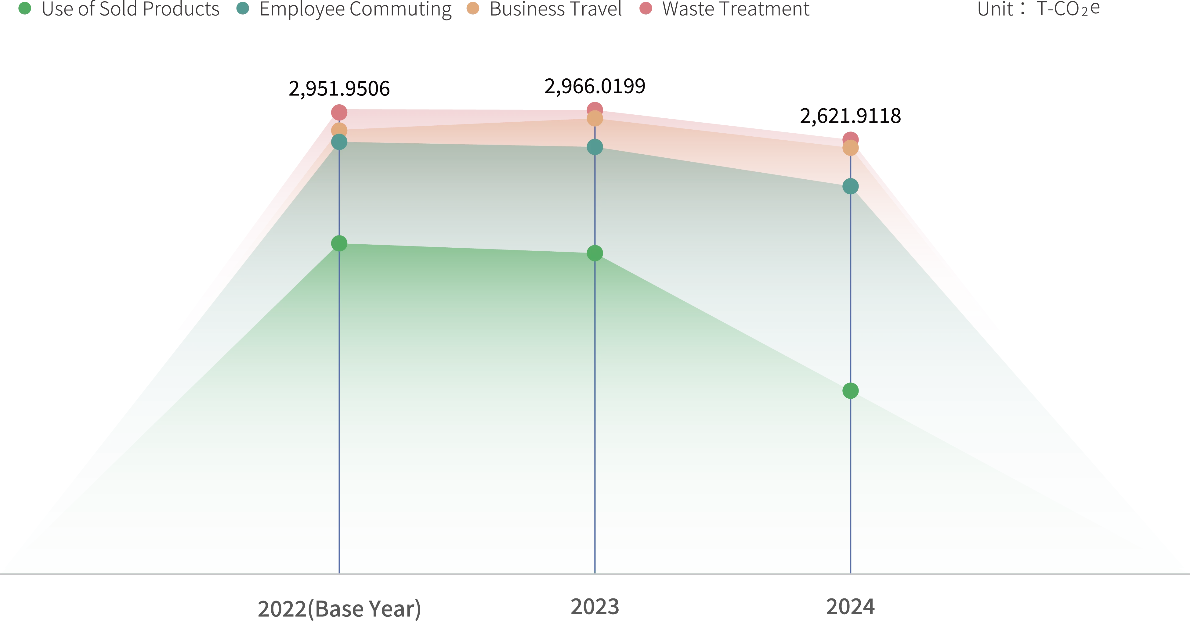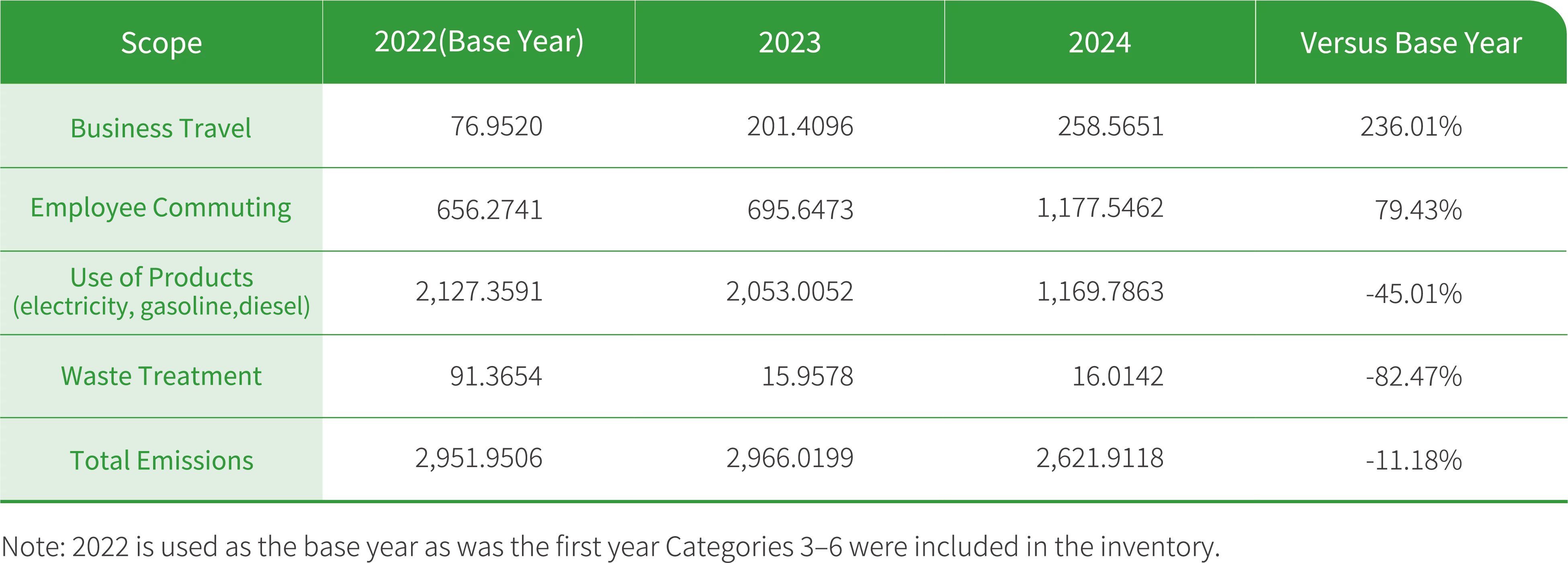 Phihong expanded the scope of its Scope 3 GHG inventory based on results of materiality assessment. In addition to existing categories such as waste treatment and energy consumption, the inventory now also covers business travel and employee commuting. In 2024, Scope 3 emissions increased compared to both the base year and 2023, mainly due to higher emissions from employee commuting and business travel. In contrast, emissions from the product usage phase showed a steady and notable decrease, down by 45.01% versus the base year. Emissions from waste treatment remained largely unchanged from the previous yea and decreased by 82.47% compared to the base year. However, as waste-related emissions account for only a small share of total Scope 3 emissions, their overall impact remains limited.