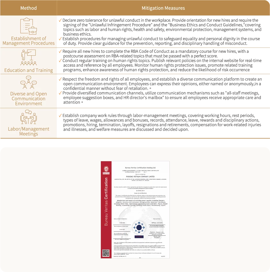 Phihong regularly reviews and strengthens human rights management mechanisms, enhances human rights awareness through education and training and employee communication, and develops targeted mitigation and improvement programs. In 2024, Phihong (Vietnam) continued to obtain the SA8000 certification, and formulated a Corporate Social Management Manual in accordance with SA8000 standards and relevant international conventions, supporting sustainable operations and responsible business practices. Phihong is committed to going beyond local regulatory requirements by integrating environmental protection, employee health and safety, and human rights considerations, thereby safeguarding the rights of stakeholders.