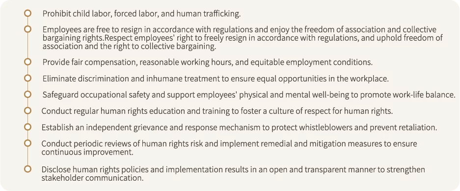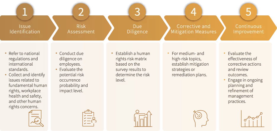 At the same time,human rights policies and management mechanisms are regularly reviewed for legal compliance, with due diligence results and improvement progress reported to the management team to fulfill social responsibility and enhance human rights awareness.
