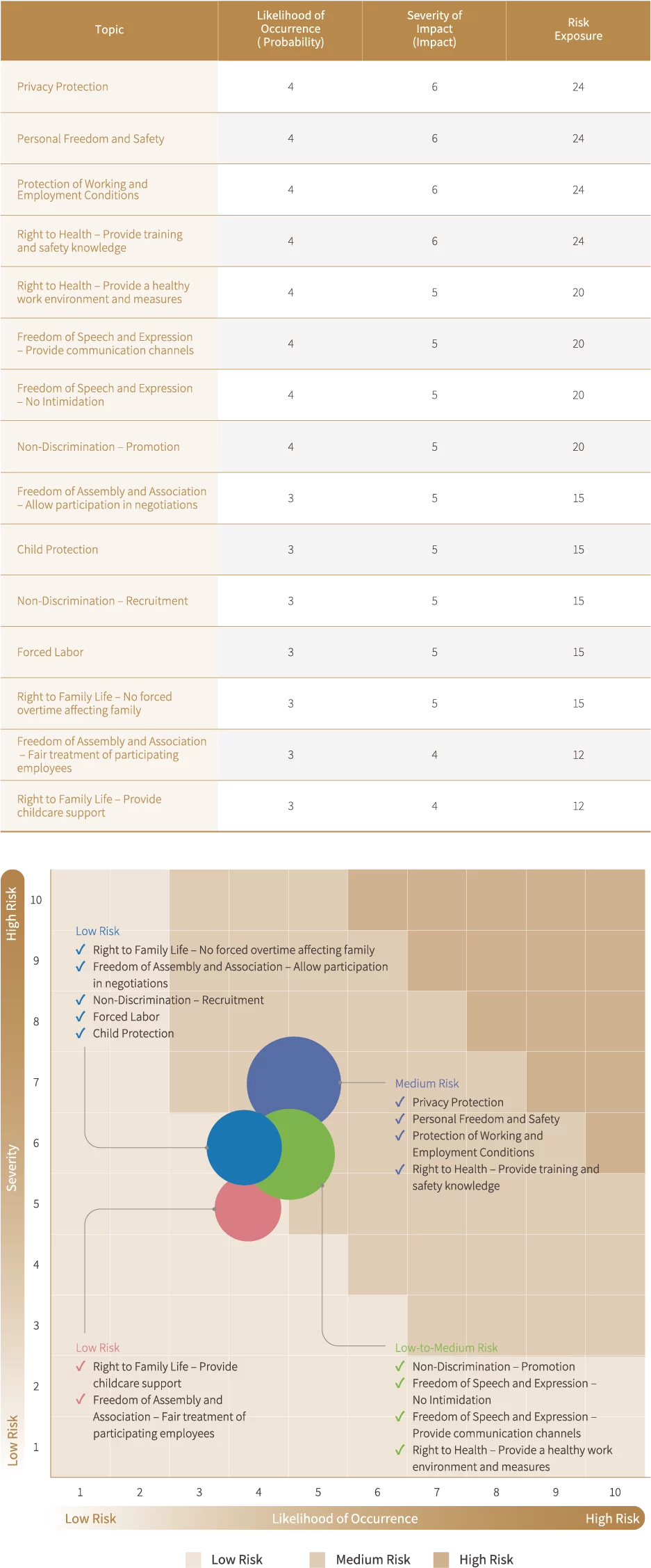In 2024, Zerova conducted a human rights risk assessment survey, distributing 378 questionnaires and receiving 352 valid responses, achieving a high response rate of 93%. The survey results all indicated that all assessed items fell within the medium to low risk range. A human rights risk matrix was established based on the formula: Risk Exposure = Likelihood of Occurrence × Severity of Impact. Topics with higher exposure values were provided to the management team to support effective risk mitigation.