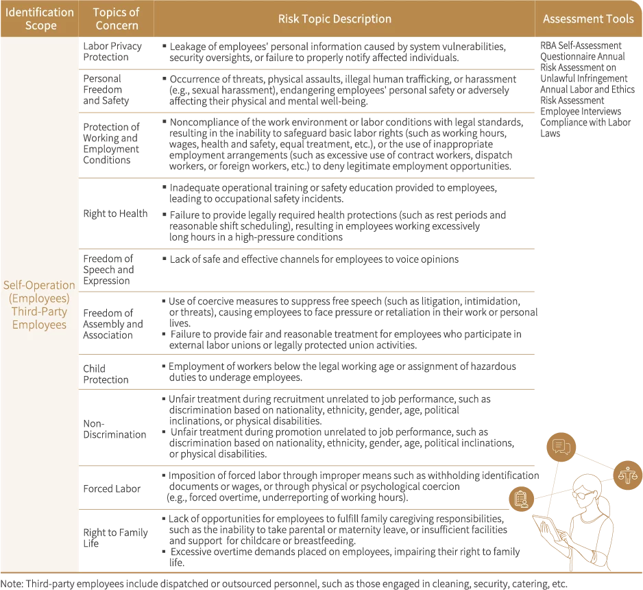 In 2024, Phihong’s subsidiary, Zerova, conducted its first comprehensive identification of human rights topics, covering its own operations as well as third-party personnel (including dispatched workers or outsourced personnel, etc.). We actively collect opinions from key stakeholders on human rights risk situations, evaluating them using a two-axis framework with severity and frequency of occurrence as the two dimensions. Risk levels were categorized on a scale from 1 to 10. Based on the identification results of human rights issues at various points in the value chain, we systematically assessed potential at-risk groups and proposed corresponding human rights risk mitigation and remediation measures. In parallel, we continuously refine our human rights policies to ensure alignment with corporate social responsibility and long-term sustainability goals.