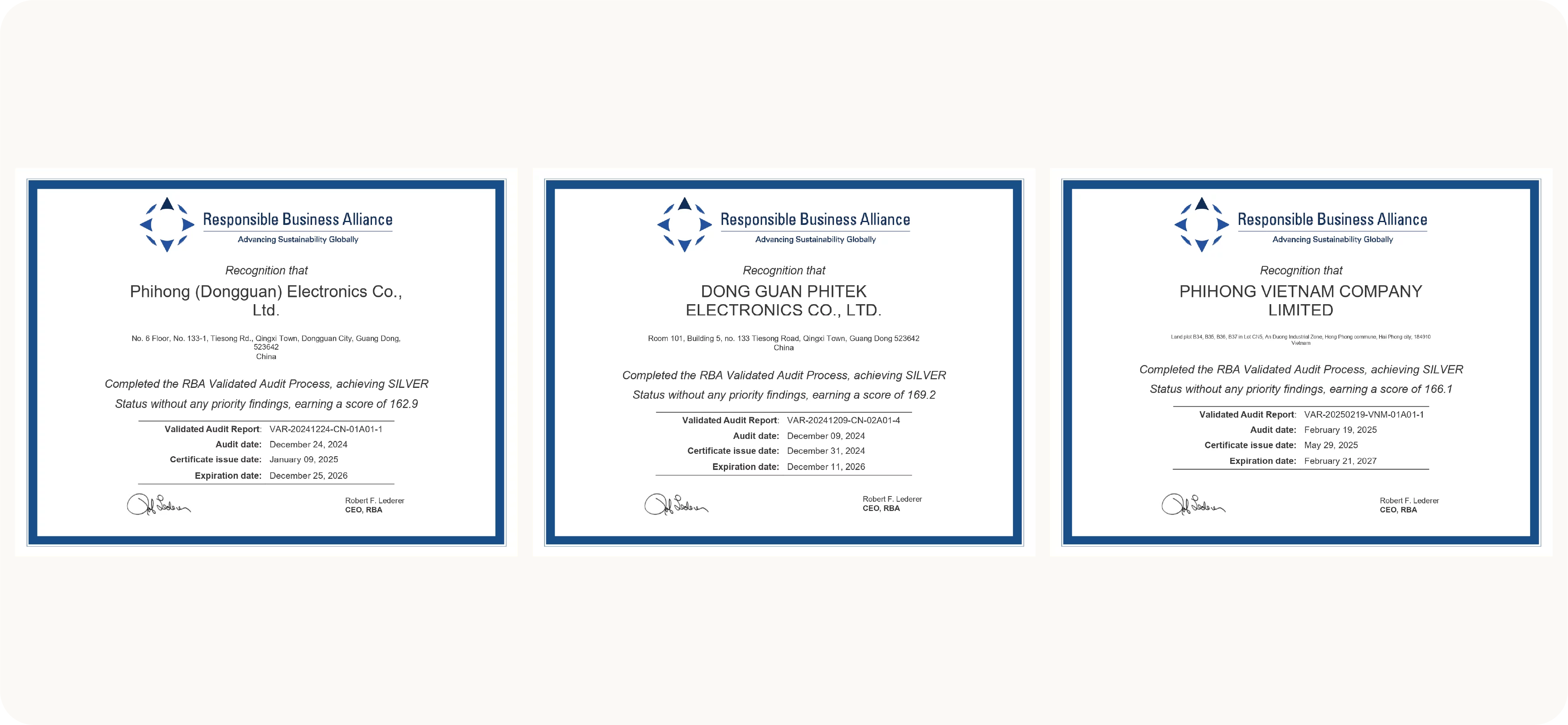 In December 2024, Phihong (Dongguan) (PHC/PHP) successfully passed the RBA VAP audit and obtained Silver Certification, achieving scores of 162.9 and 169.2, respectively. In March 2025, Phihong (Vietnam) also passed the RBA VAP audit and successfully obtained certification. Through this verification process, Phihong demonstrated the compliance and implementation of its internal systems, thereby fulfilling its social responsibility values and fully aligning with the RBA 8.0 standards. Phihong is committed to continuously improving its internal management systems, conveying sustainability awareness to supply chain partners, and strengthening management and resilience to gain global customer recognition and expand sustainable business opportunities.