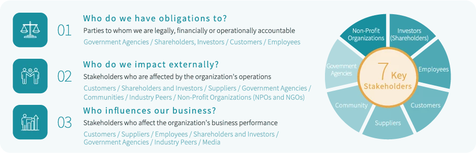 To ensure that the information disclosed in this report meets stakeholder expectations, Phihong collected and identified its list of stakeholders based on the three criteria: the parties to whom the organization is accountable, those impacted by its operations, and those who influence business performance. With reference to the GRI Sustainability Reporting Standards and the five core principles of AA1000SES 2015, namely responsibility, influence, tension, diverse perspectives, and dependency, the Company conducted an assessment to determine seven key stakeholder groups. Internal and external surveys were carried out to gather their priority concerns, followed by statistical analysis of the results.