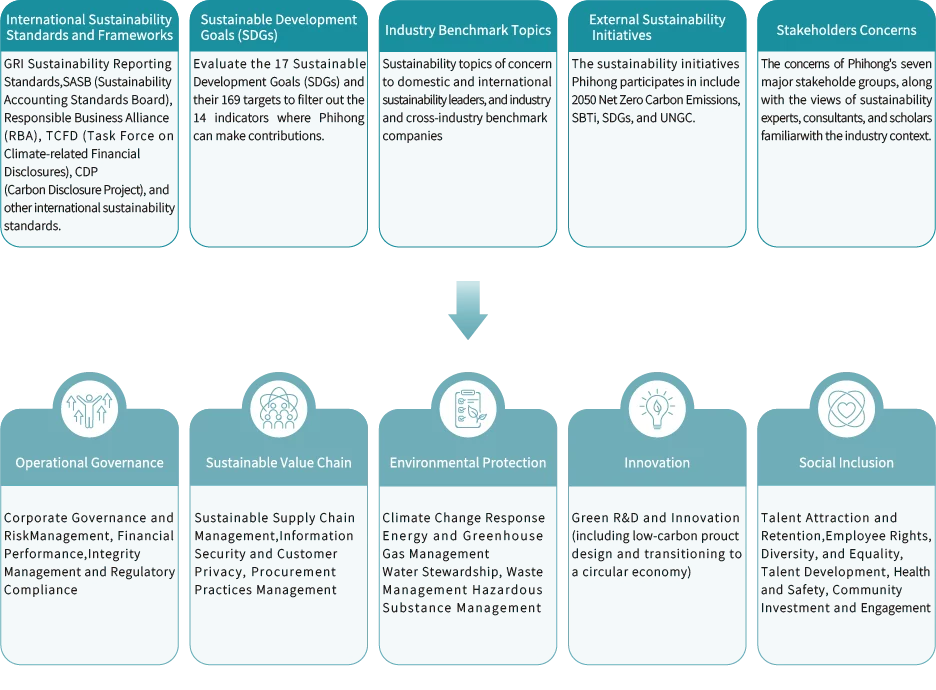 Phihong convenes members of the Sustainable Development Committee to identify sustainability issues related to internal and external operational activities. External issues include international sustainability standards and frameworks, the Sustainable Development Goals (SDGs), industry benchmark sustainability topics, external initiatives, and issues raised by stakeholder. Internal issues cover the Company’s management philosophy, the Sustainable Strategy Blueprint, and organizational goals. A total of 84 operational activities were compiled. After discussions with department colleagues and the highest executives from each business group, these were consolidated into 17 sustainability topics.