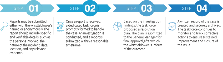 Phihong has established a formal reporting channel for stakeholders. The Manager of the Audit Office, under the Board of Directors, serves as the designated contact person responsible for receiving and handling complaint cases and reporting investigation results to the relevant supervisors. The Company ensures strict confidentiality regarding the identity of the complainant and the content of the complaint. All cases are investigated and addressed proactively. If any individual is found to have violated professional ethics or relevant codes of conduct, complaints can be submitted through the following contact information.