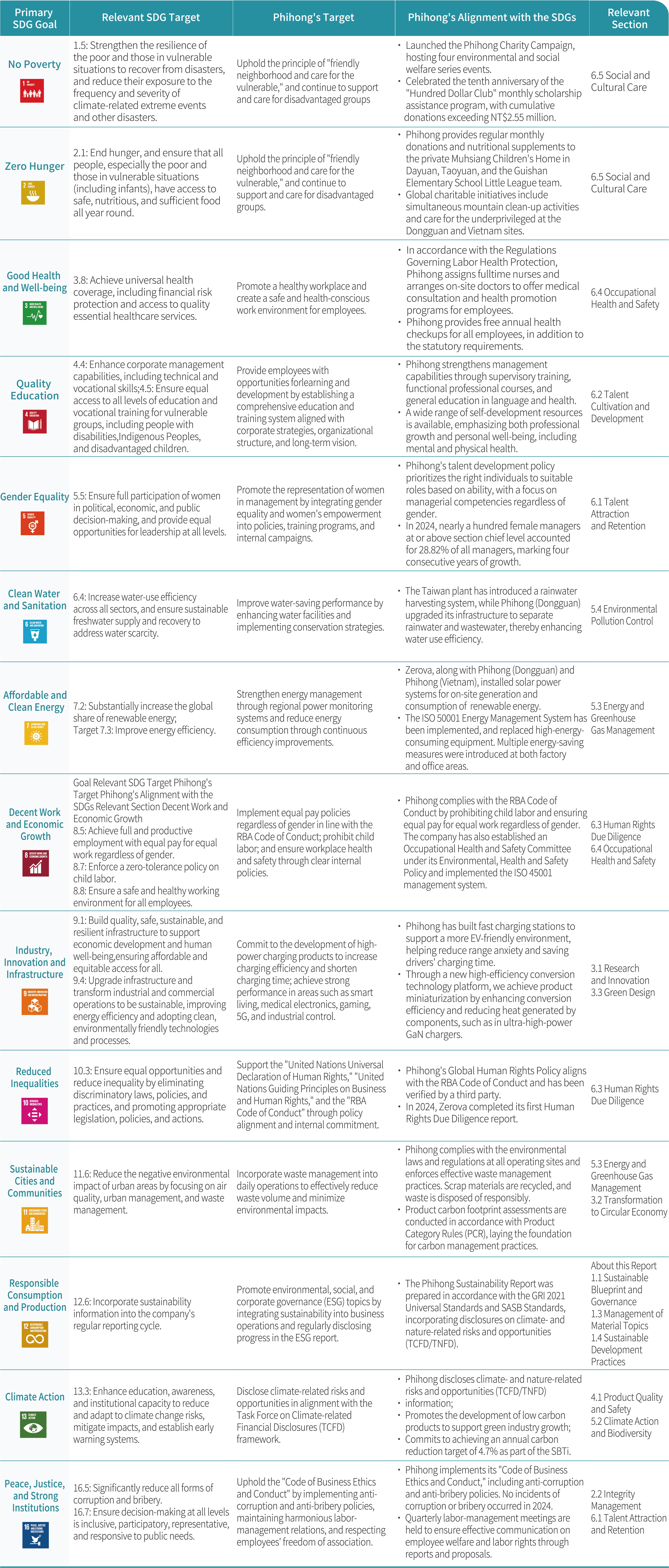 Building on the 17 core SDGs, Phihong has identified 14 goals that are most closely aligned with our substantial business activities, designating them as the annual focus areas for implementation efforts. This approach underscores our commitment to embedding sustainability into every aspect of our operations. We bring the spirit of the SDGs into our day-to-day processes by setting clear objectives and regularly tracking progress through the Sustainable Development Promotion Team to ensure tangible results.