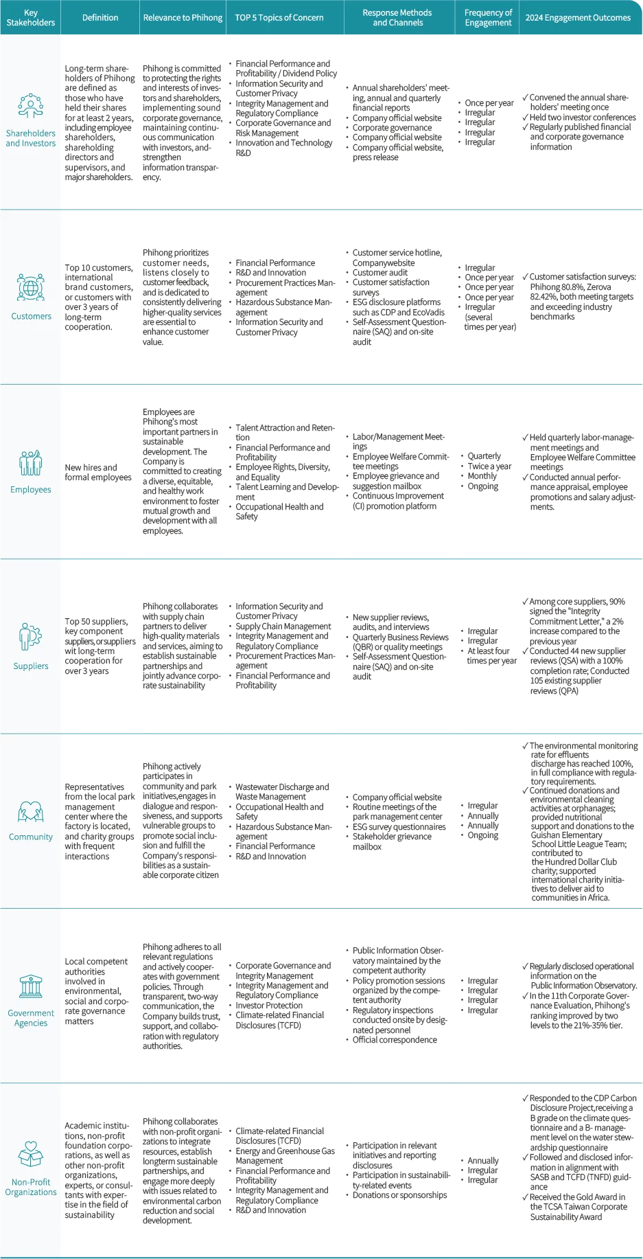 Phihong follows the four major principles of the AA1000 Stakeholder Engagement Standard (AA1000 SES): Materiality, Effectiveness, Flexibility, and Respect. Through a variety of channels and mechanisms, the Company listens to, understands, and responds to stakeholders’ perspectives and needs. By maintaining ongoing communication and engagement, Phihong fosters mutual trust and shared value creation. To ensure the effective implementation of material topics, the Phihong Sustainable Development Office regularly reviews the identification of material topics and the formulation of related goals. At least once per year, the status of stakeholder communication, including survey results on the level of attention to sustainability topics, is reported to the Board of Directors. The 2024 stakeholder engagement status has been submitted to the Company’s Board of Directors.