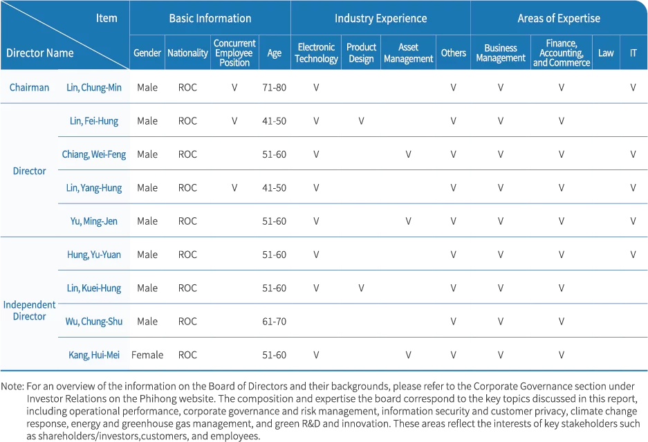 Their profiles are available on the Company’s official website and in the 2024 Annual Report.Directors (including independent directors) are elected for a three-year term through a candidate nomination system, which ensures a fair, impartial, and transparent selection process. There are four independent directors, representing 44.5% of the board. Their independence is assessed and confirmed in accordance with relevant regulations. Phihong places great importance on board diversity. In 2024, a female independent director was elected. Her nomination was considered by the Nominating Committee during the selection process and finalized through voting at the shareholders’ meeting in accordance with the Company Act. The nominee’s sustainability impact management capabilities were also taken into consideration. Such qualifications will continue to be incorporated into future nomination and selection criteria.