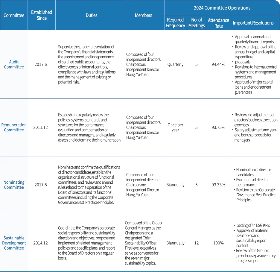 The Board of Directors convenes at least once per quarter to revise internal control policies and procedures, review business performance, and deliberate on major impacts and strategic issues. Managers regularly attend board meetings to present updates on operations, finance, and business matters. During meetings, directors also provide professional insights on significant proposals and decisions for management’s reference. In 2024, a total of eight board meetings were held, with a commendable director attendance rate of 97.01%.