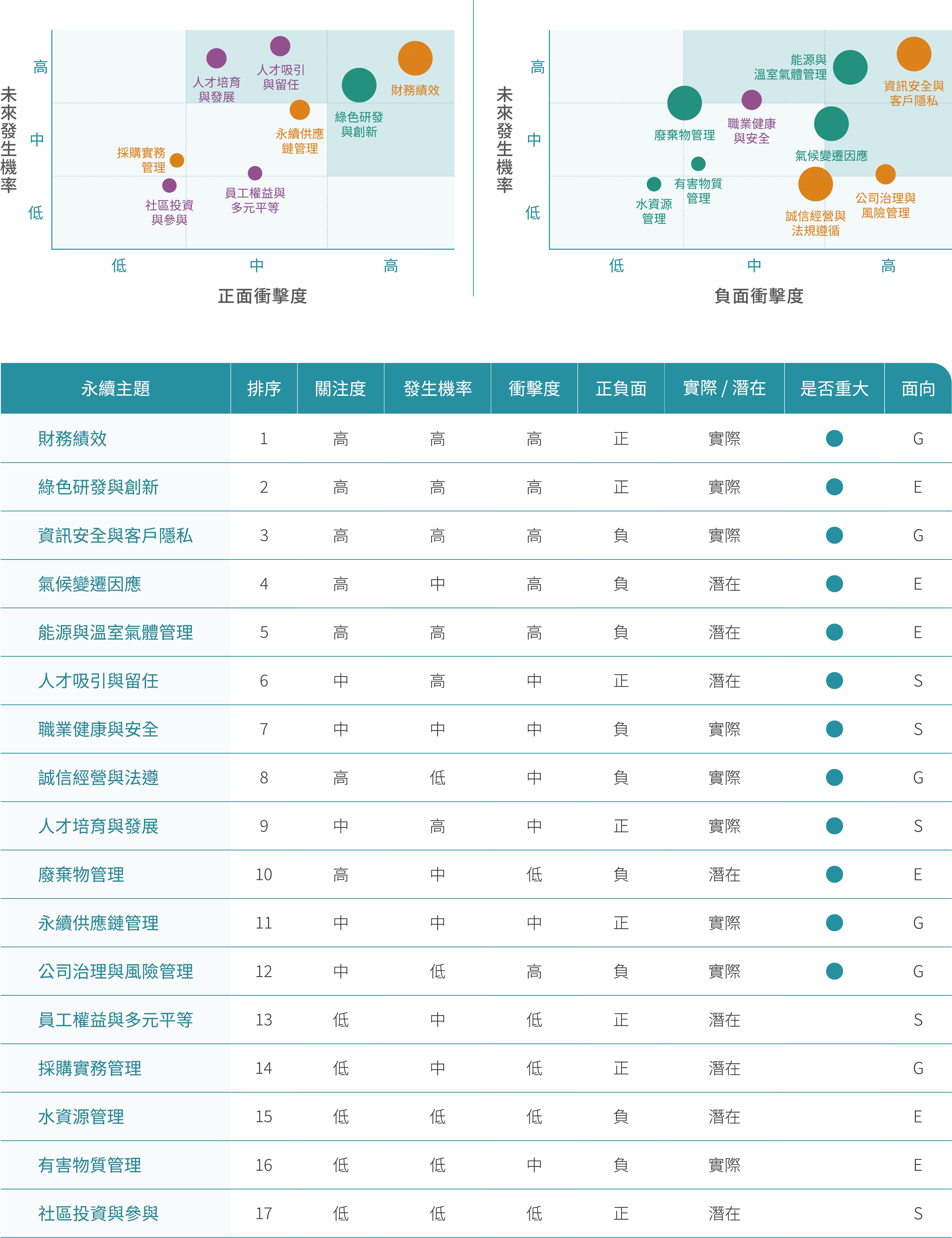 依據GRI 通用準則 2021 版對重大性的最新定義,飛宏識別並統整 17 項利害關係人關注的永續議題,評估組織對外部的經濟、環境與社會(包括人權)的實際與潛在衝擊。經由重大議題矩陣分析,並與各單位、永續發展委員會及推動小組研後,確立12 項具有高度及中高度重大性的永續議題,作為報告揭露的核心基礎,詳述其管理方式與績效成果。相較於前一年度的報告,2024 年度新增 「廢棄物管理」 一項重大議題,以確保資訊完整性與永續管理的連續性。